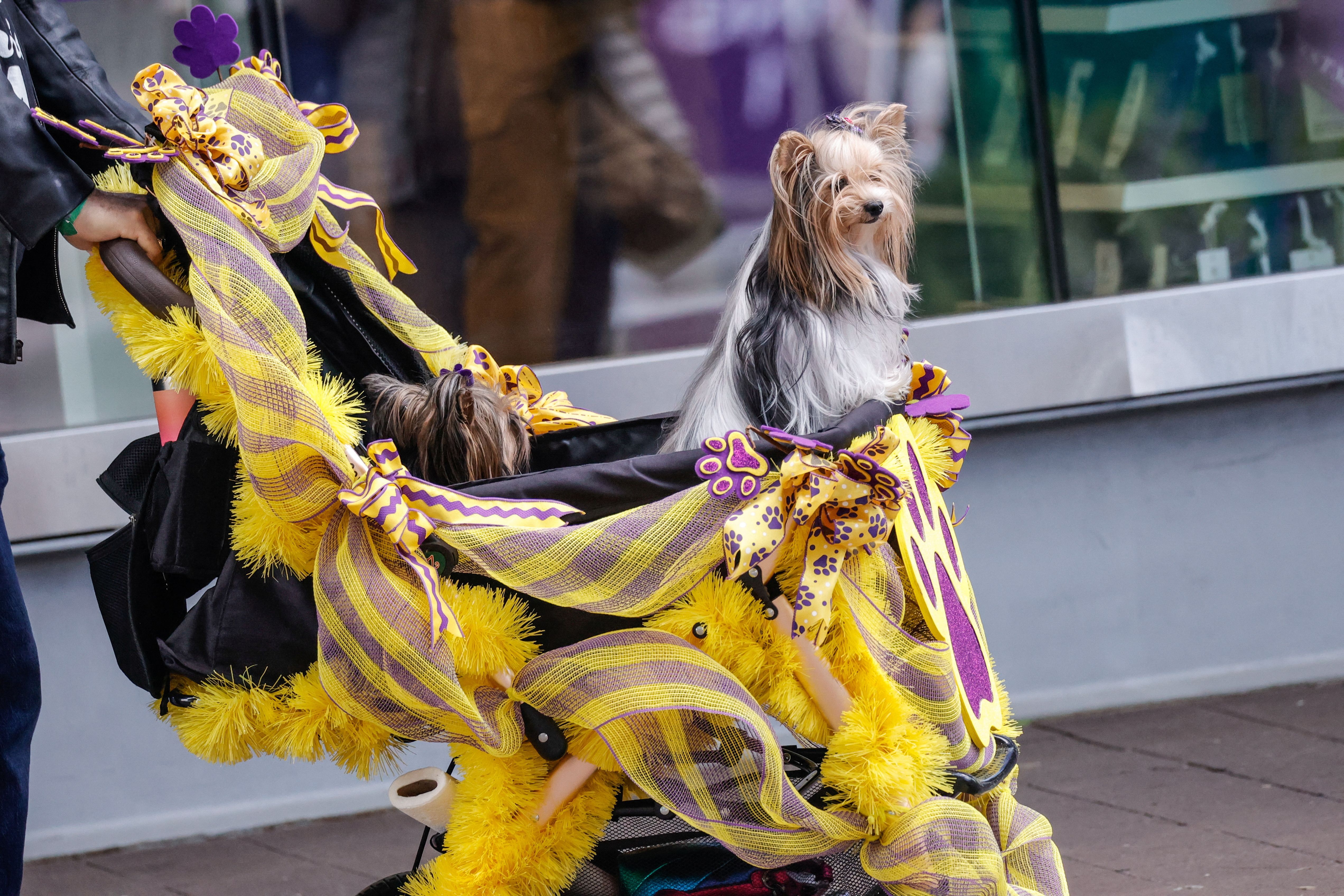 Dogs are carried on a stroller during the 148th Westminster Kennel Club Dog Show at the USTA Billie Jean King National Tennis Center in New York, on May 11, 2024. (Photo by Kena Betancur/Reuters)