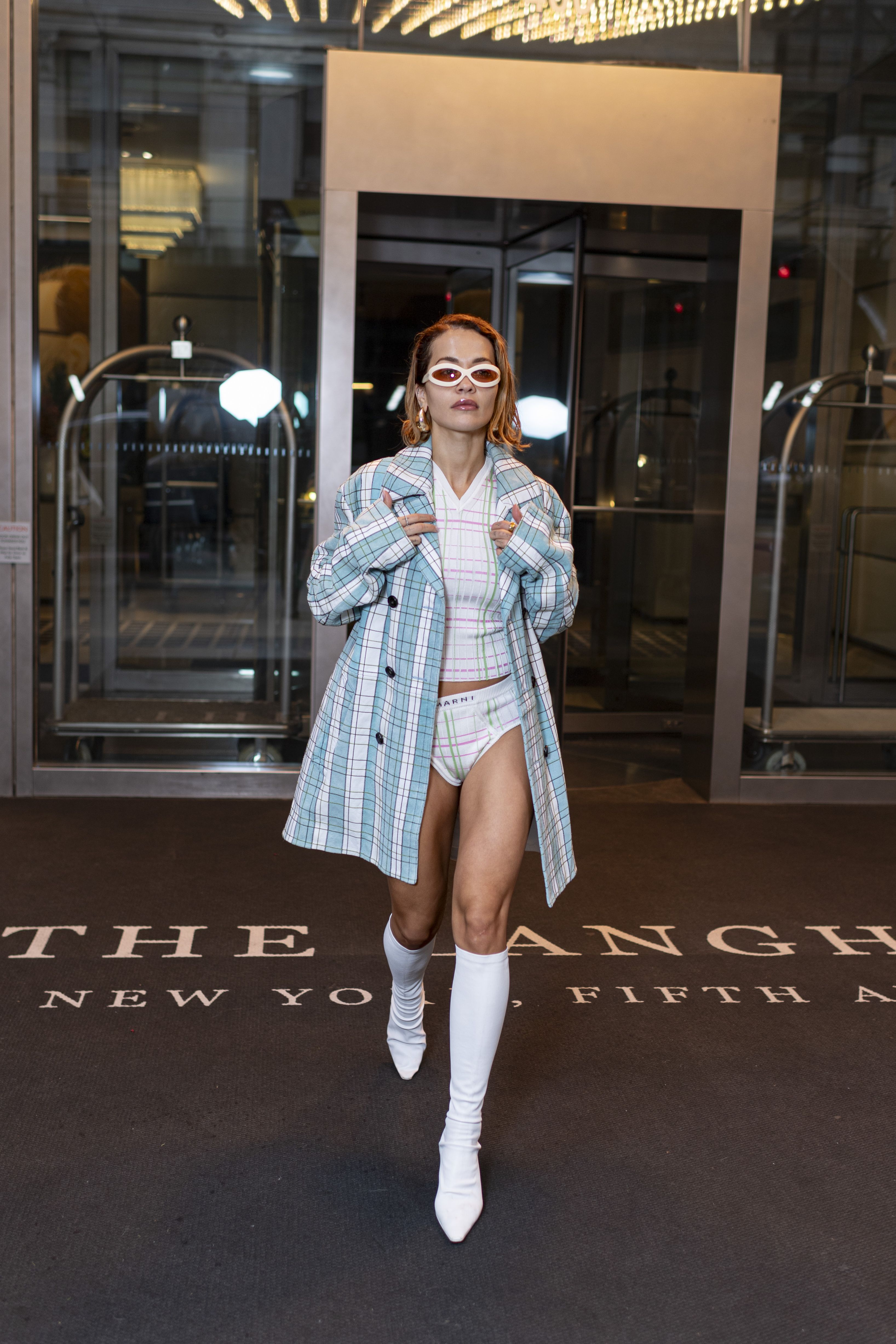 British singer-songwriter Rita Ora on May 5, 2024 arrives dressed as Marni at a hotel in New York to do fittings for the Met Gala. (Photo by Shutterstock/Splash News and Pictures)
