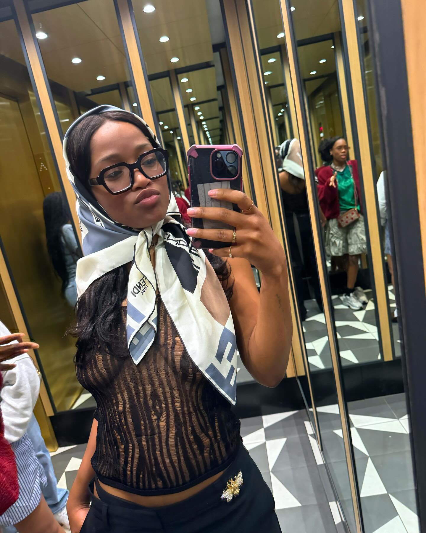 American actress, singer, and television host Keke Palmer early May 2024 snaps a selfie in a sheer number. (Photo by keke/Instagram)