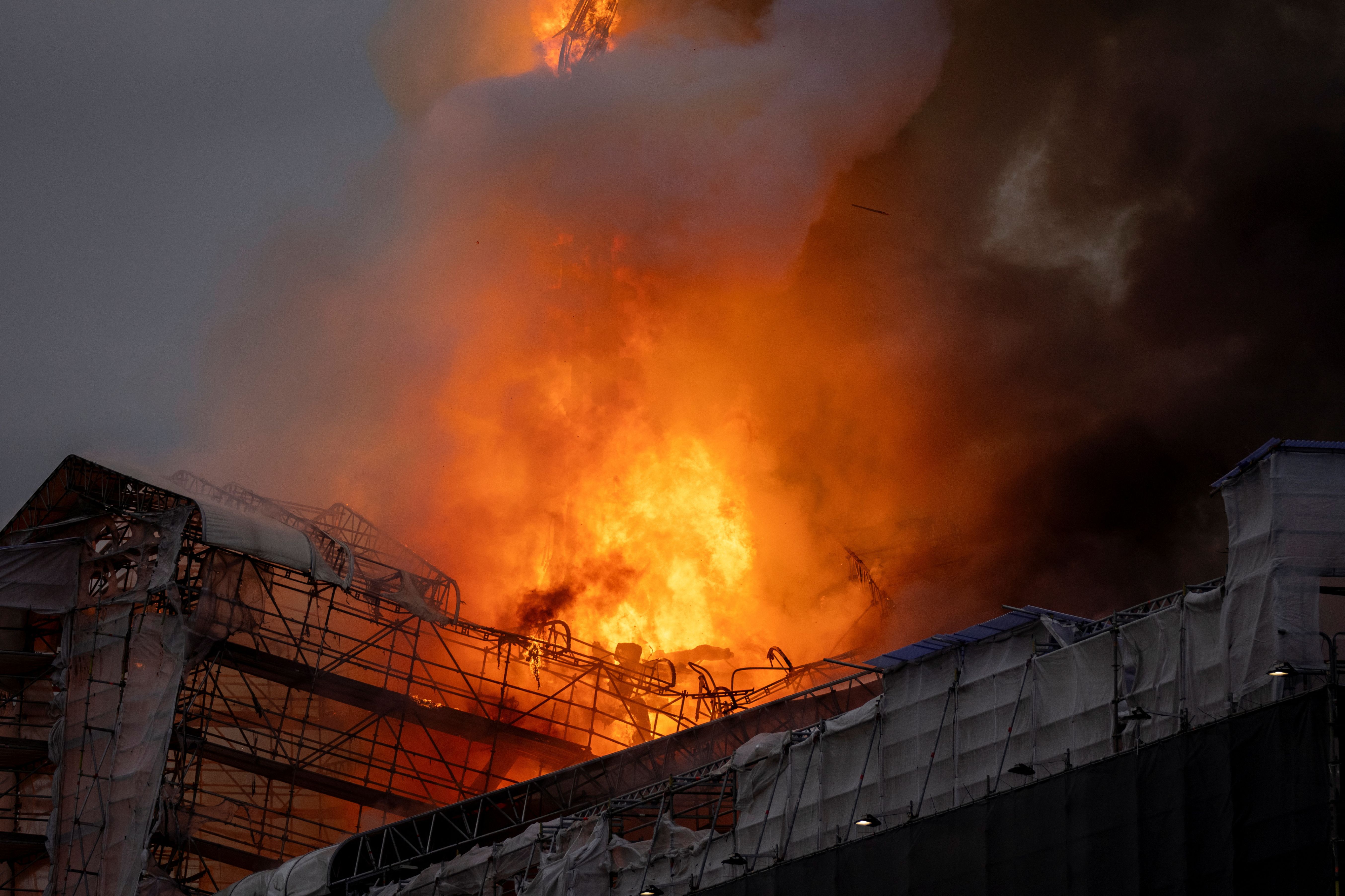 Fire burns at the Old Stock Exchange, Boersen, in Copenhagen, Denmark on April 16, 2024. (Photo by Ida Marie Odgaard/Ritzau Scanpix via Reuters)