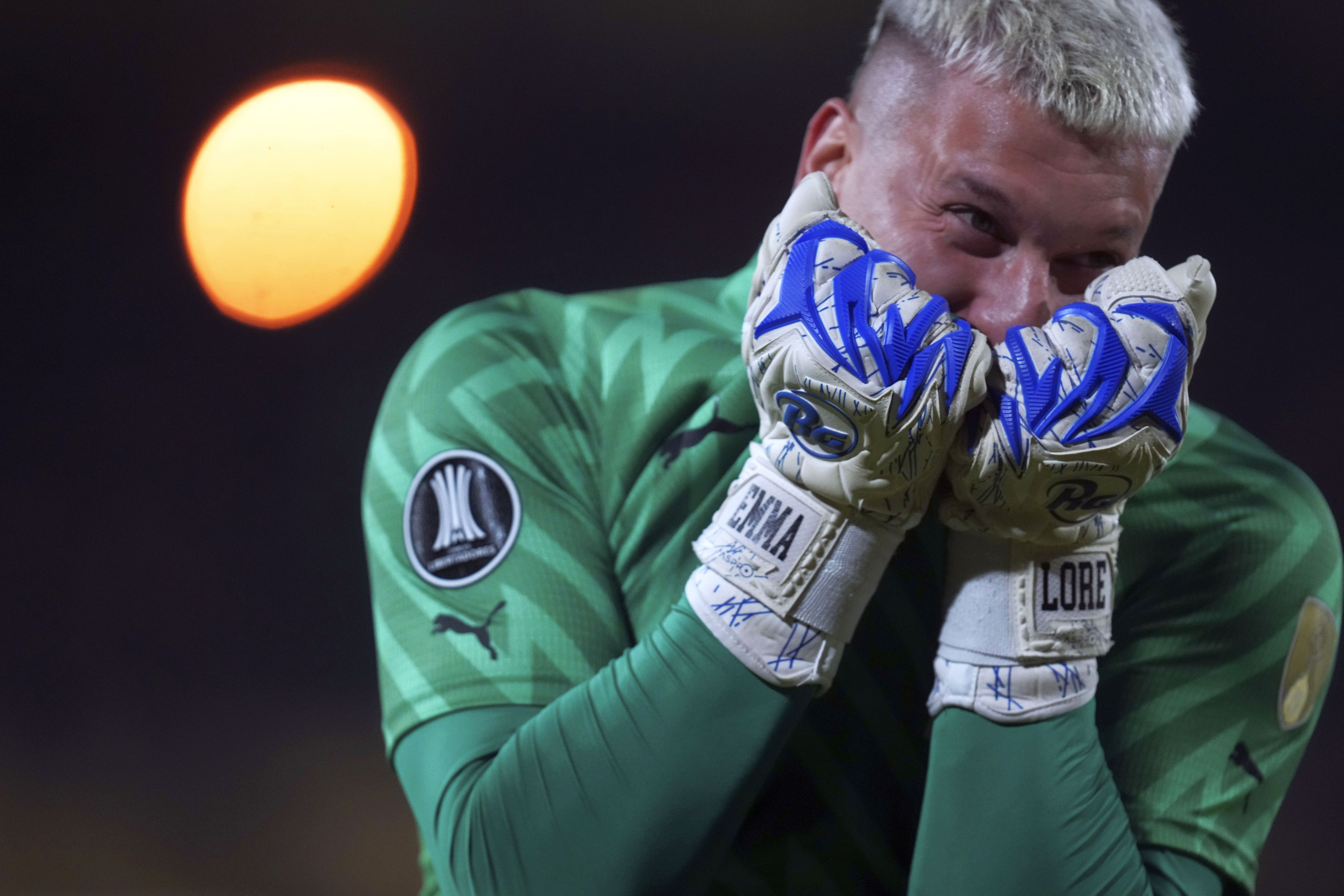 Goalkeeper Guillermo De Amores of Uruguay's Penarol celebrates his team's second goal against Brazil's Atletico Mineiro during a Copa Libertadores Group G soccer match at Campeon del Siglo Stadium in Montevideo, Uruguay, May 14, 2024. (Photo by Matilde Campodonico/AP Photo)