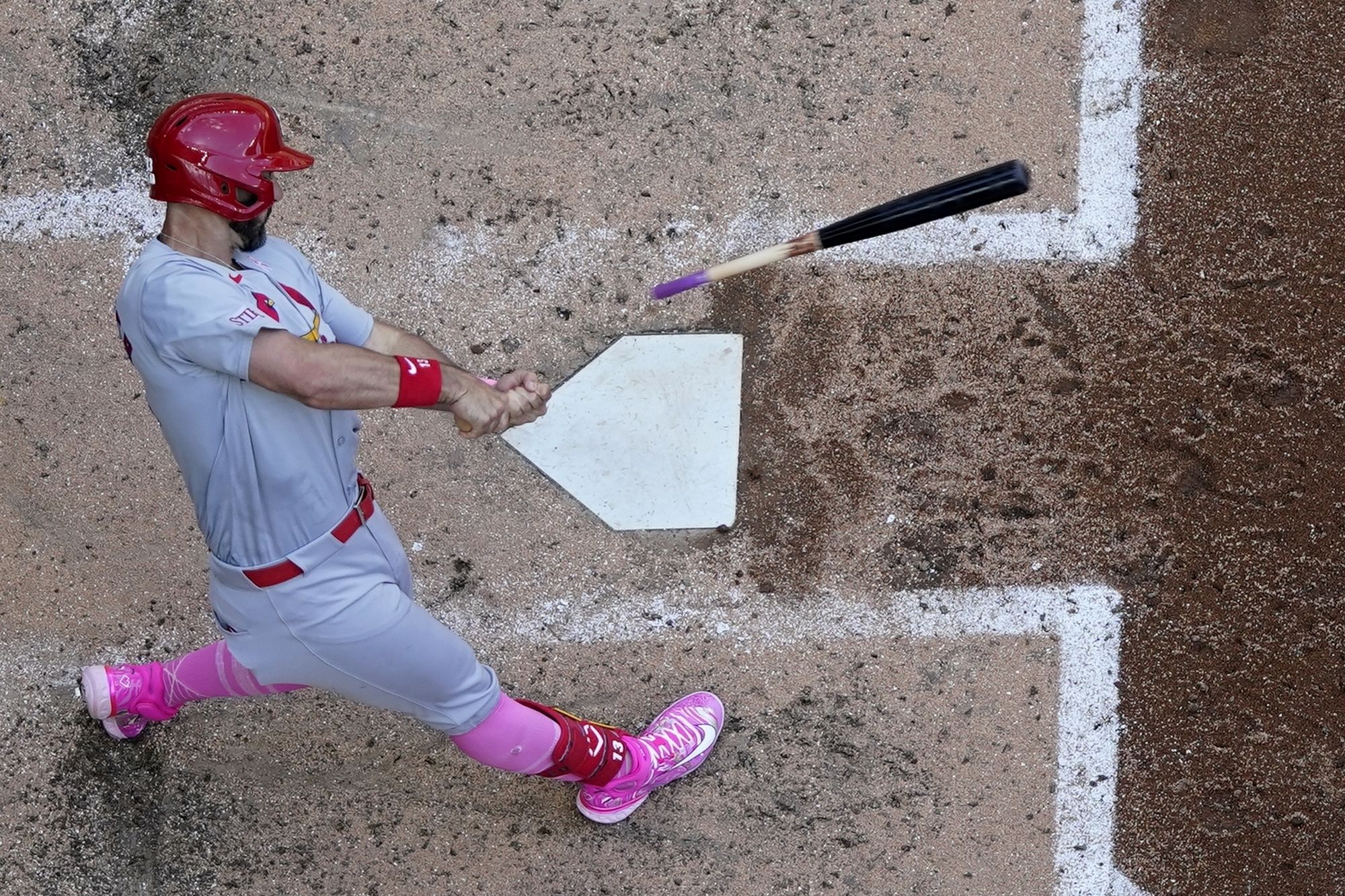 St. Louis Cardinals' Matt Carpenter breaks his bat as he fouls a pitch during the fourth inning of a baseball game against the Milwaukee Brewers Sunday, May 12, 2024, in Milwaukee. (Photo by Morry Gash/AP Photo)