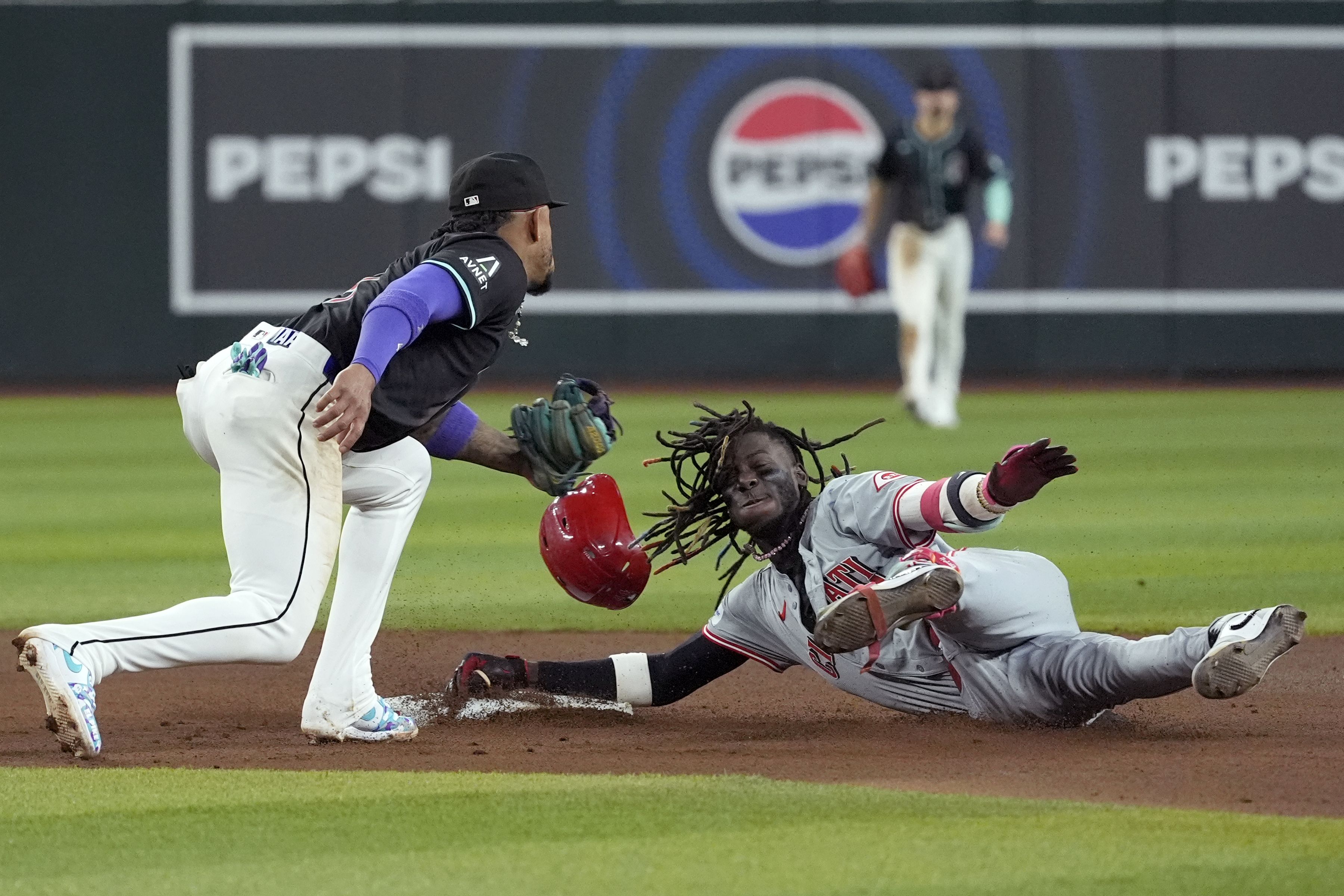 Arizona Diamondbacks second base Ketel Marte, left, tags out Cincinnati Reds shortstop Elly De La Cruz, right, at second base as De La Cruz tries to stretch a single into a double during the seventh inning of a baseball game Monday, May 13, 2024, in Phoenix. (Photo by Ross D. Franklin/AP Photo)