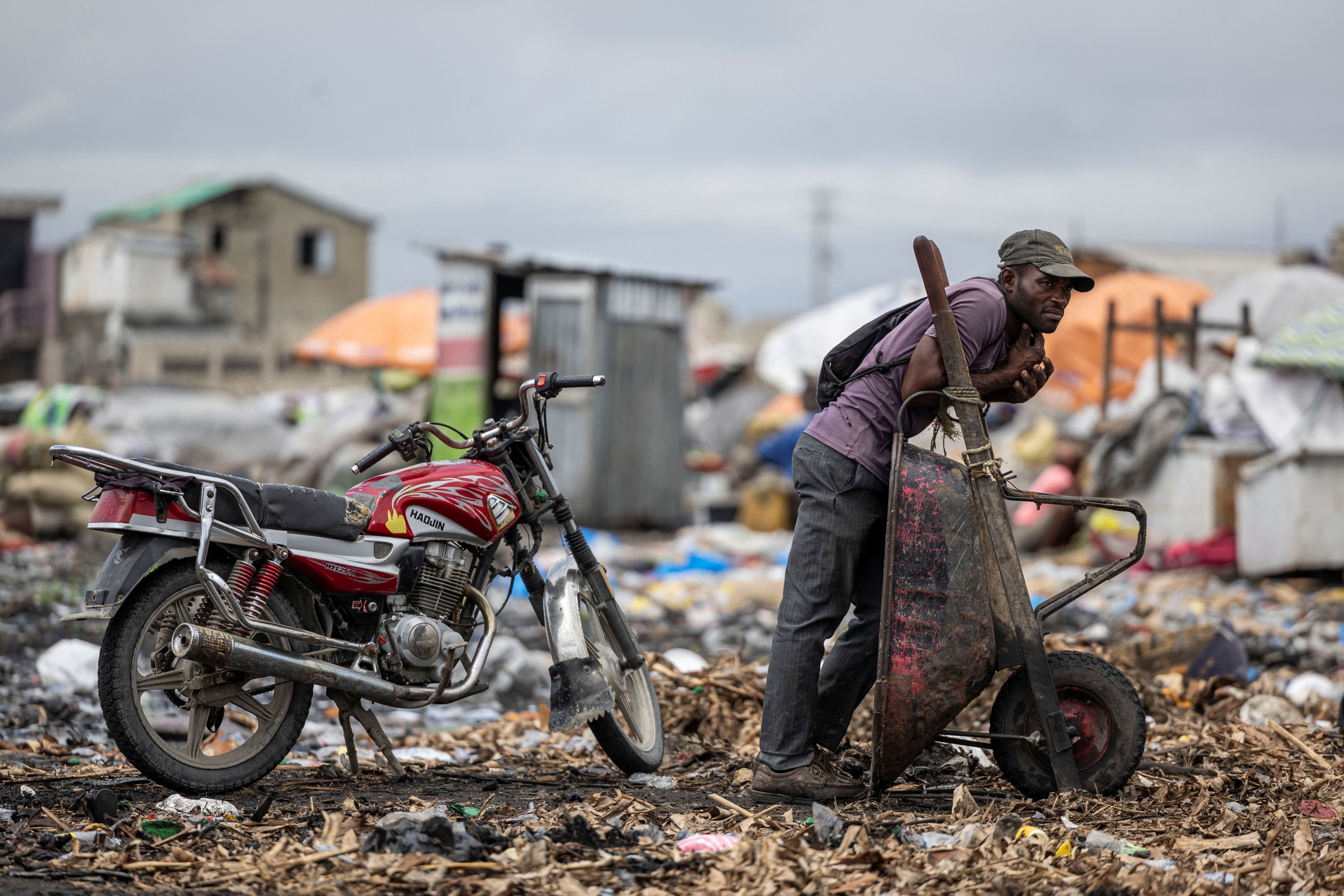 A man looks on as he leans on a wheelbarrow in Cap-Haitien, Haiti on April 25, 2024. (Photo by Ricardo Arduengo/Reuters)