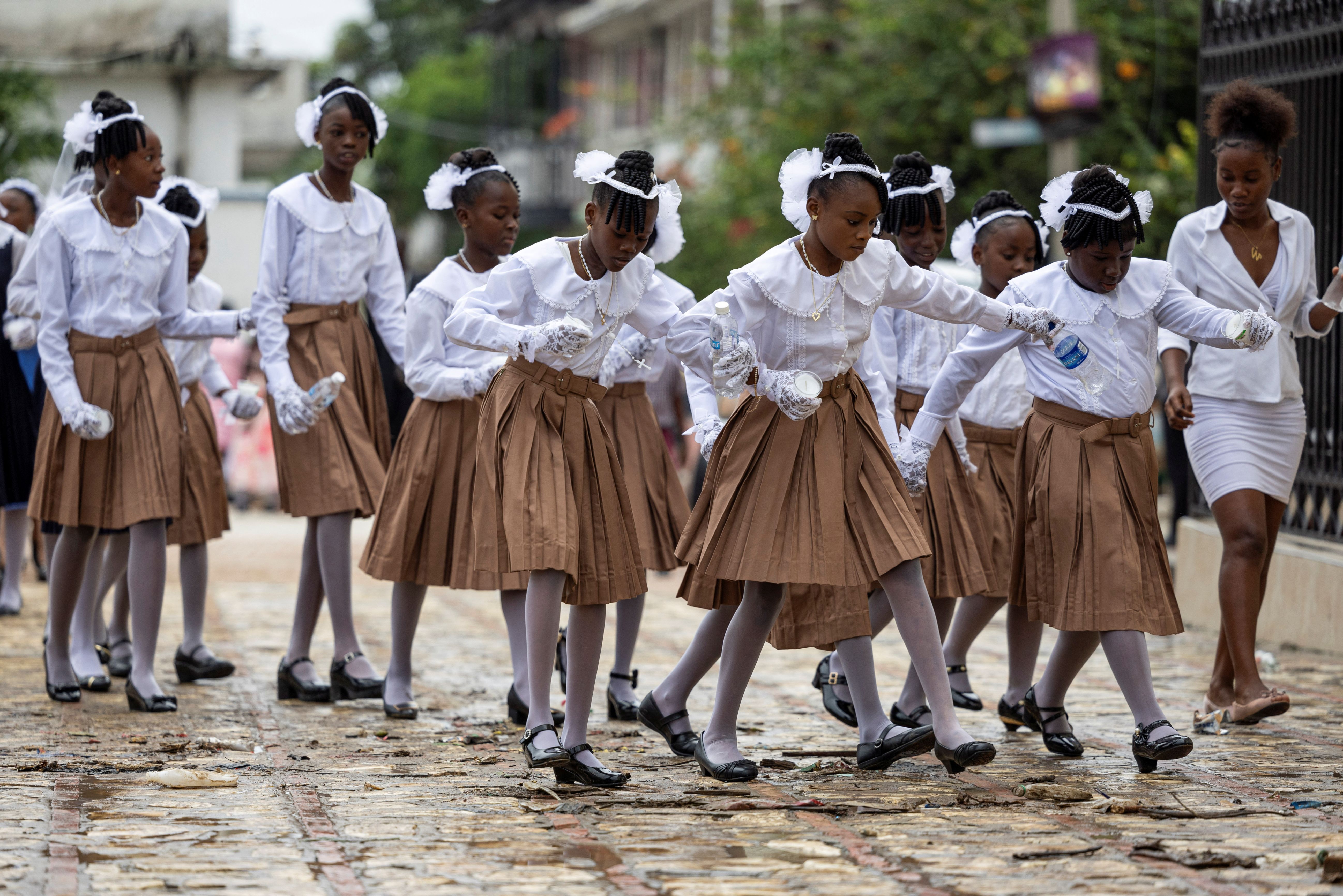 A group of girls arrive at the Our Lady of the Assumption Cathedral for their confirmation ceremony in Cap-Haitien, Haiti on April 28, 2024. (Photo by Ricardo Arduengo/Reuters)