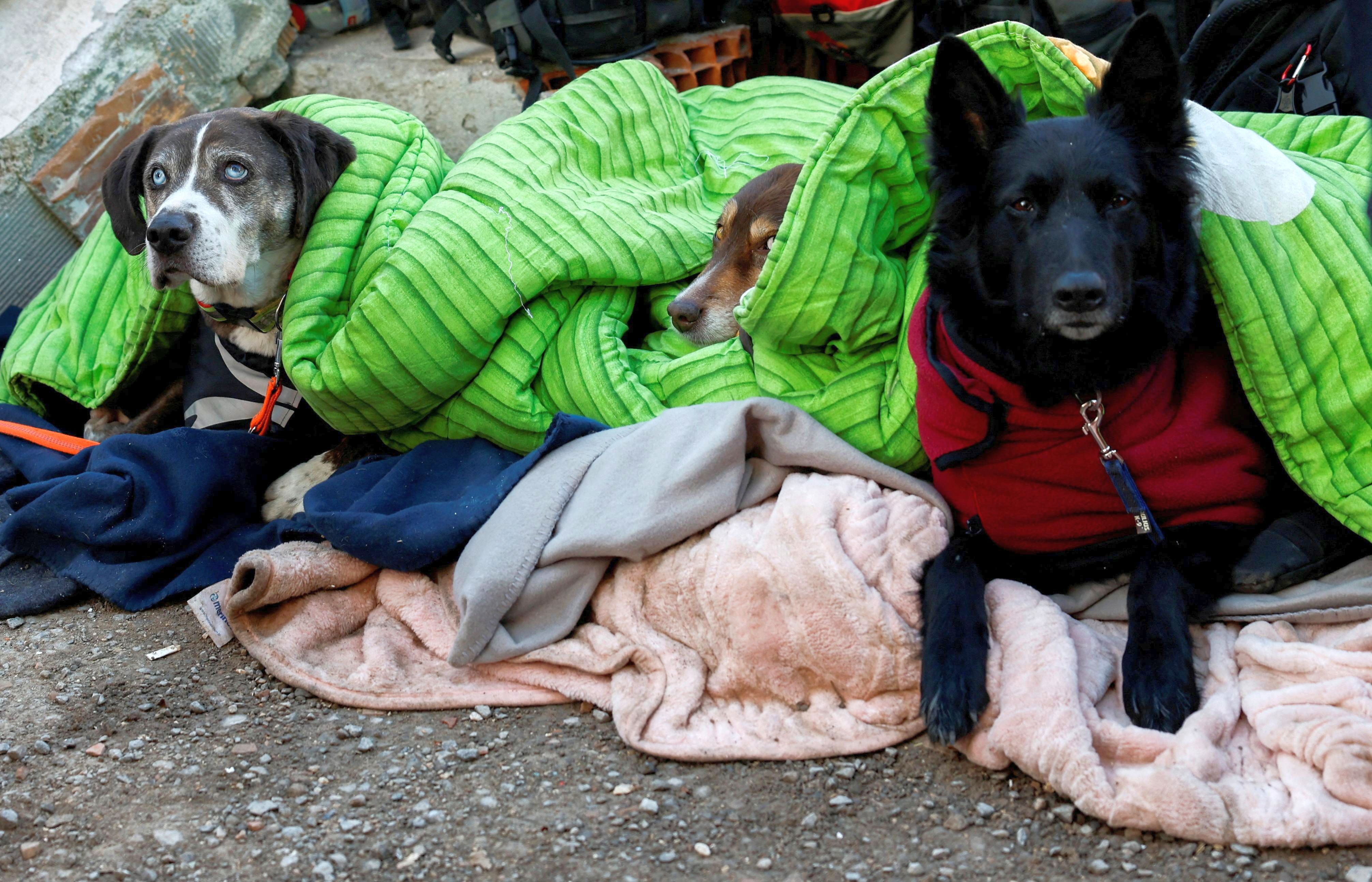 Rescue dogs, of German International Search and Rescue (ISAR) team, covered in blankets rest as search and rescue operations continue, in the aftermath of a deadly earthquake, in Kirikhan, Turkey on February 9, 2023. (Photo by Piroschka van de Wouw/Reuters)