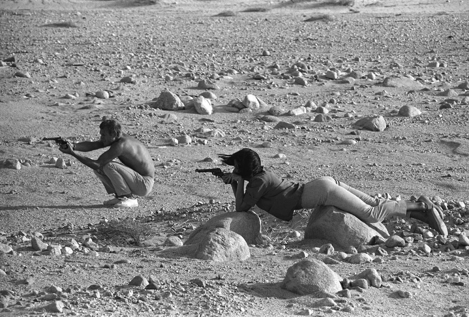 American actor “The King of Cool” Steve McQueen and Neile Adams, his first wife, target-practice with their pistols in the Palm Springs desert in 1963. (Photo by John Dominis/Life)