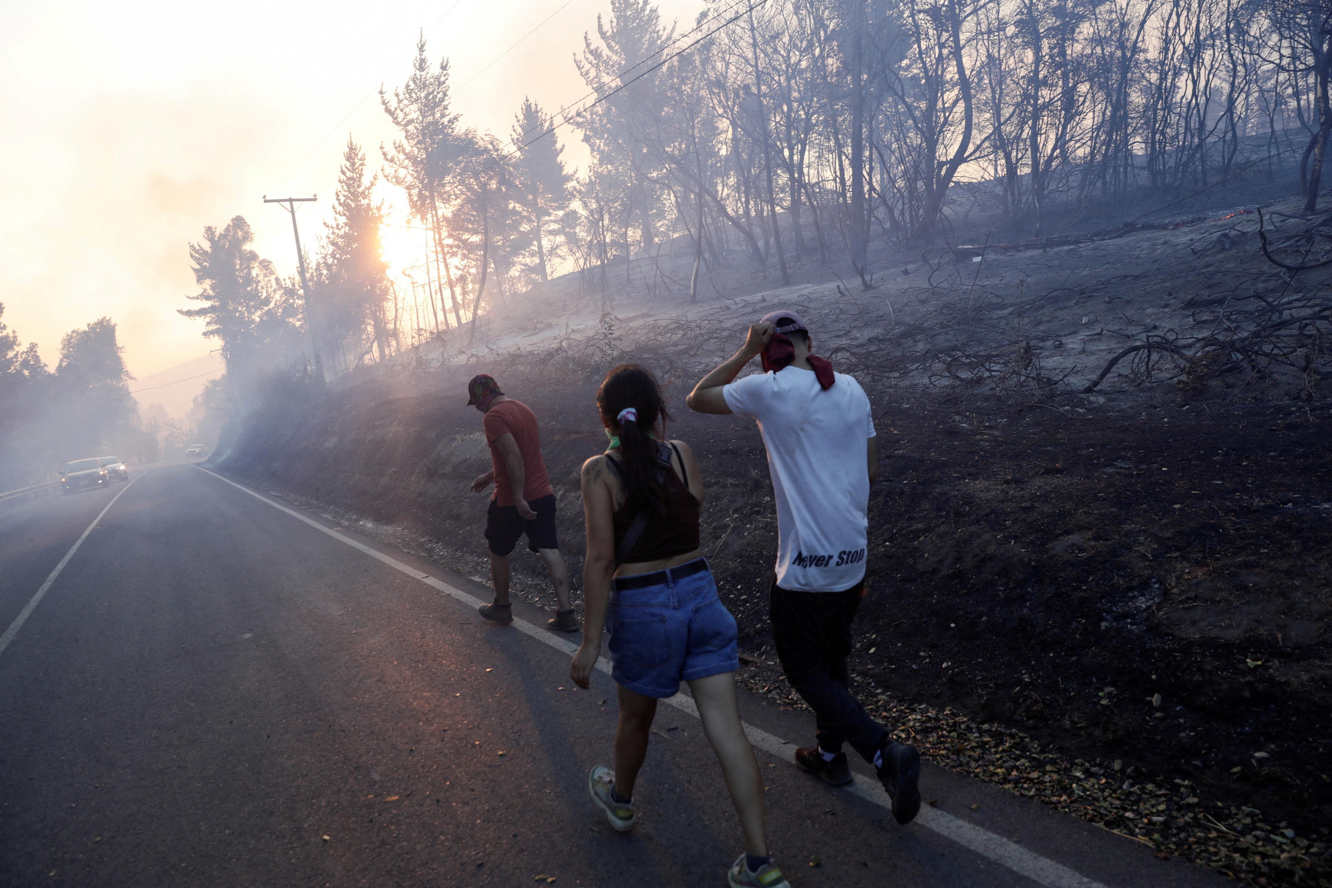 Residents walk to their homes, in an area affected by a wildfire, that burned parts of rural areas in Quillon, Chile on February 2, 2023. (Photo by Juan Gonzalez/Reuters)