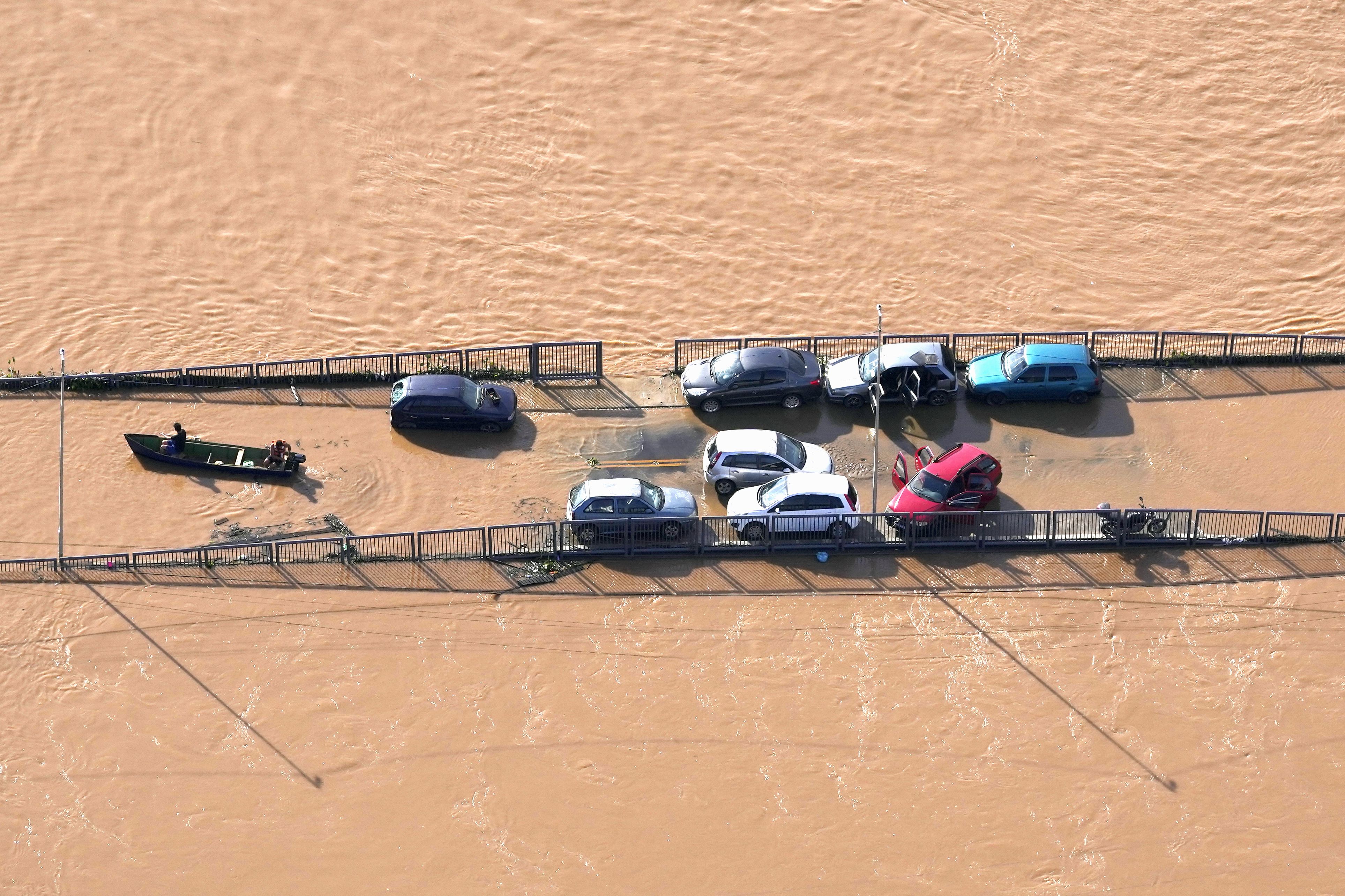 Cars sit on a submerged road in an area flooded by heavy rain in Porto Alegre, Rio Grande do Sul state, Brazil, Wednesday, May 8, 2024. (Photo by Andre Penner/AP Photo)