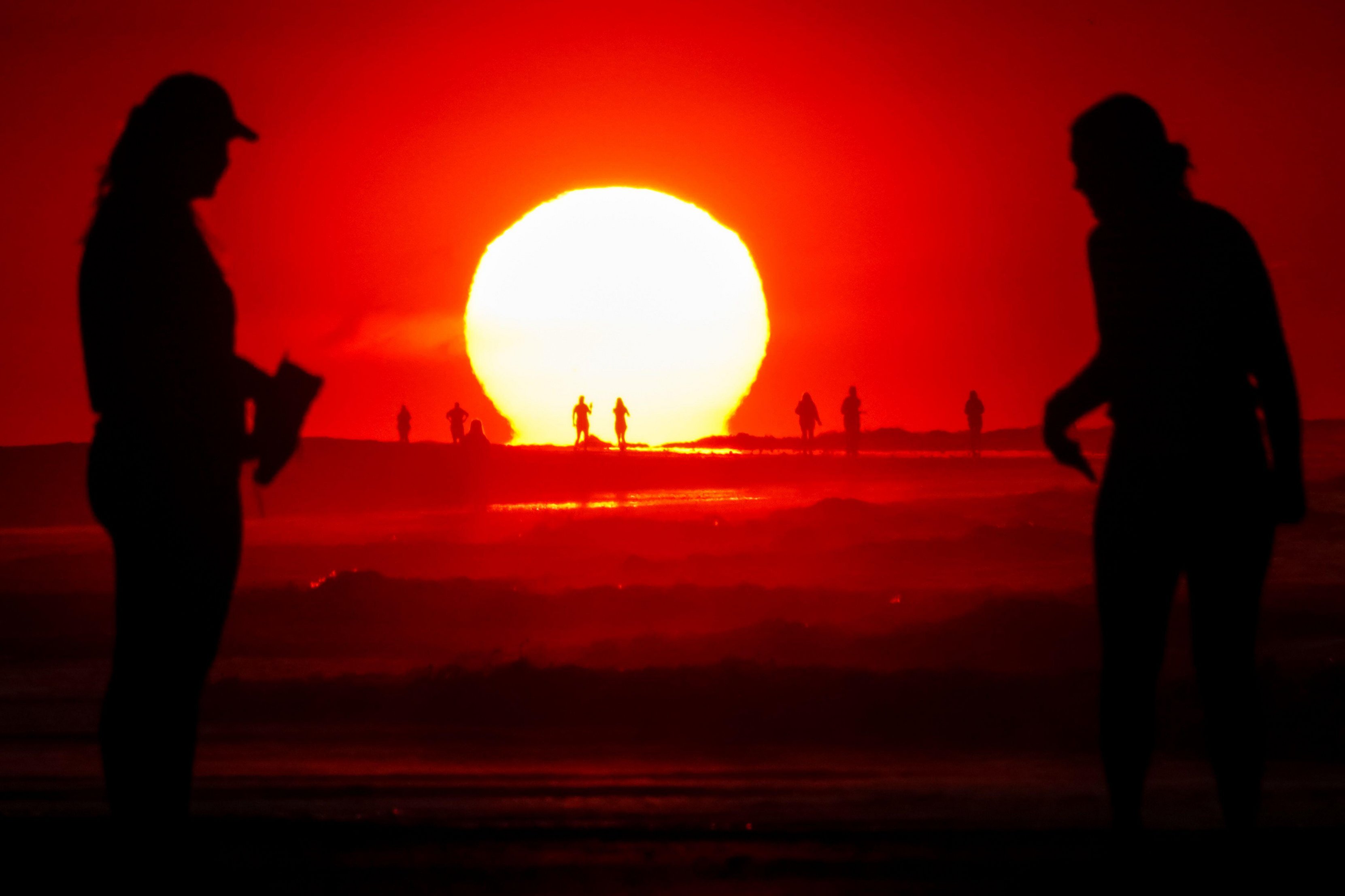 People, silhouetted by a dramatic sunrise, gather along the beach on a clear, hot day, May 16, 2024 in Isle of Palms, South Carolina. (Photo by Richard Ellis/Alamy Live News)
