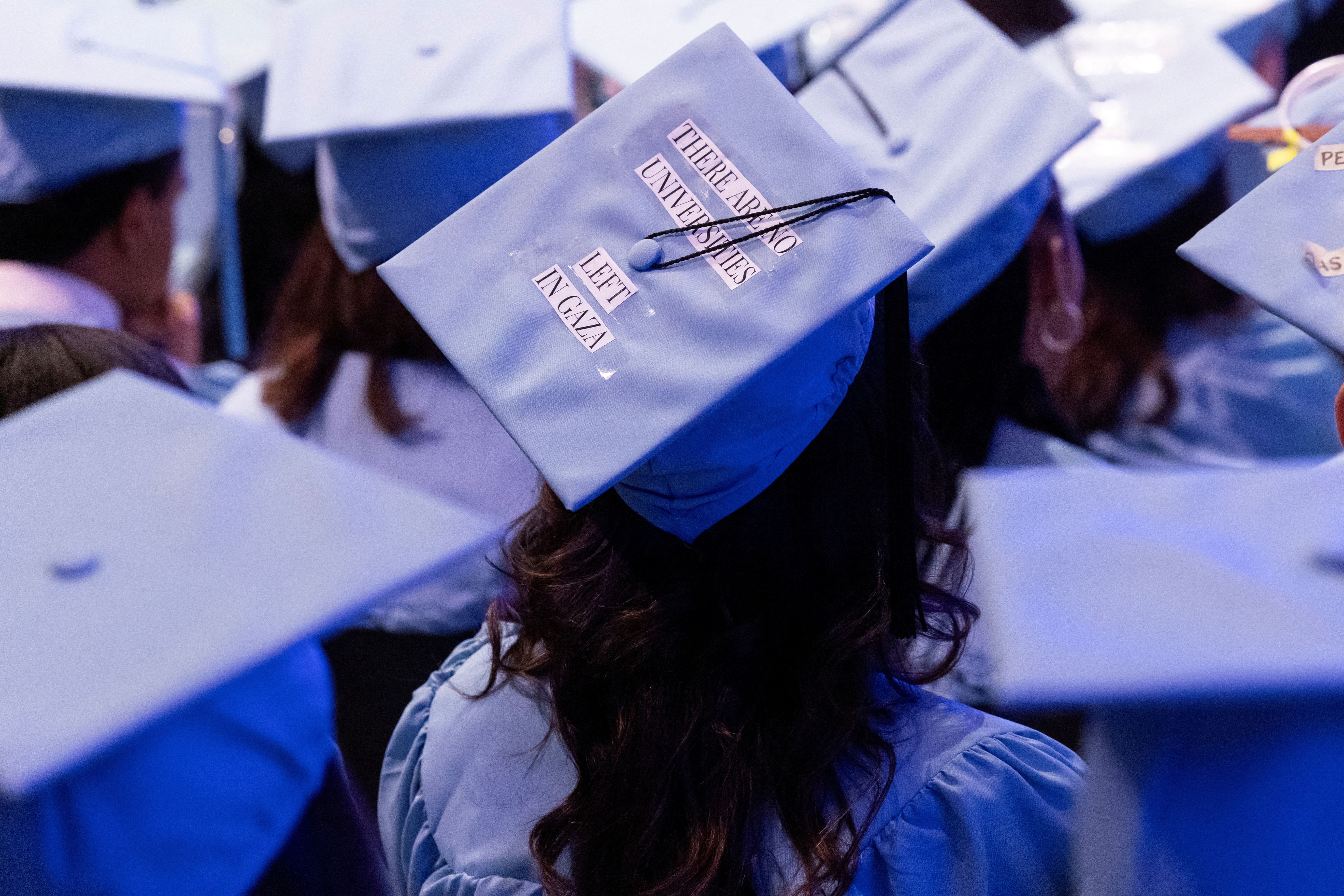 A student wears a statement on their cap in support of Palestinians during a graduation ceremony at Columbia University Journalism School, during the ongoing conflict between Israel and the Palestinian Islamist group Hamas, in New York City on May 15, 2024. (Photo by Caitlin Ochs/Reuters)