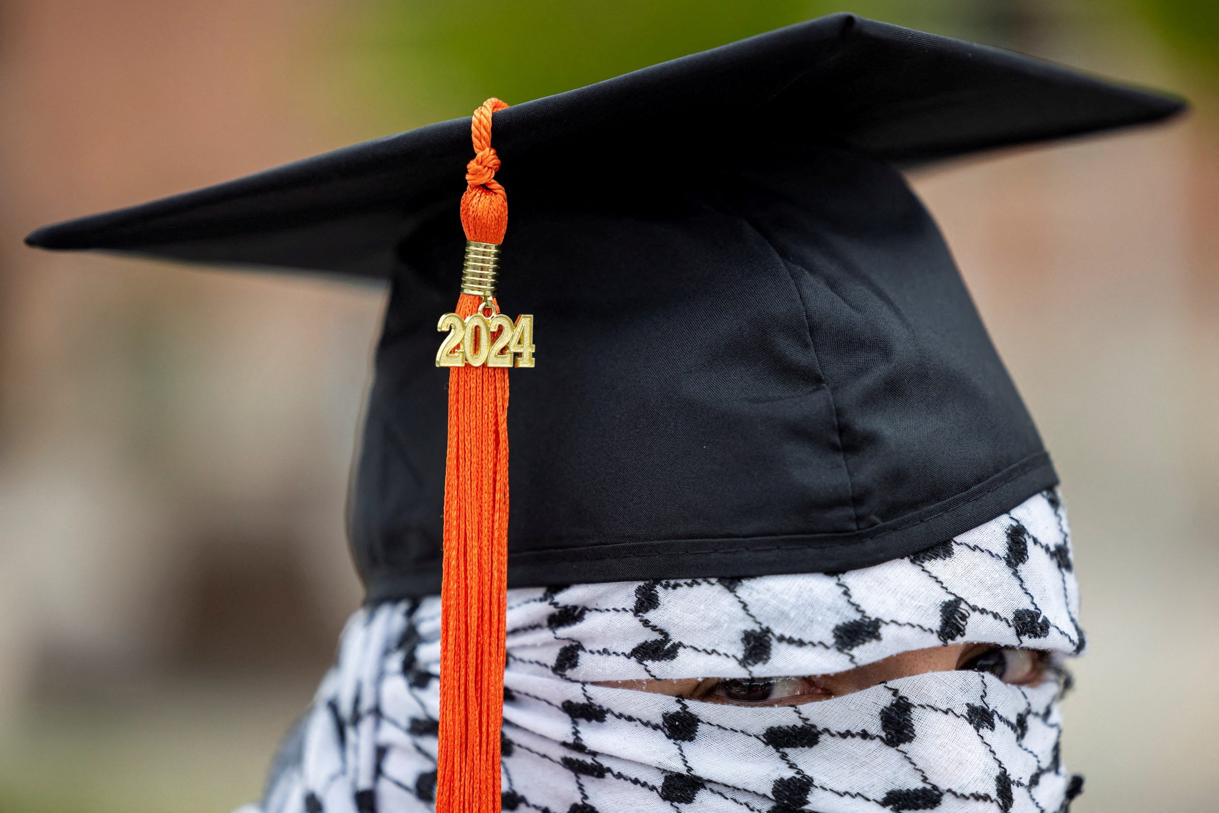 A Palestinian student, who plans to return to his homeland after graduation and who wishes to remain anonymous, poses for a portrait while wearing a keffiyeh along with his commencement cap and 2024 tassel, amid the ongoing conflict between Israel and the Palestinian Islamist group Hamas, at the Auraria Campus in Denver, Colorado, on May 10, 2024. (Photo by Kevin Mohatt/Reuters)