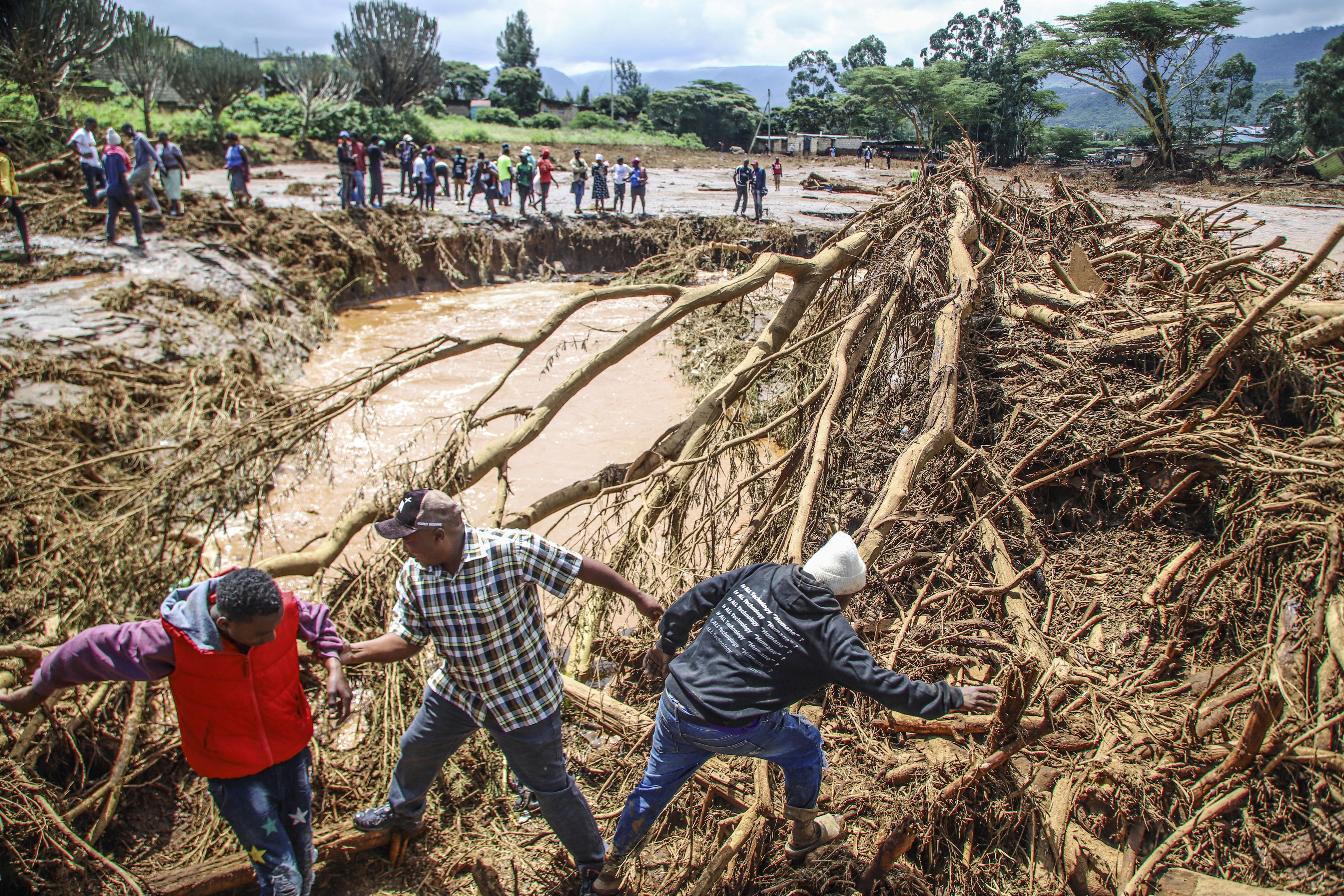 People try to clear the area after a dam burst, in Kamuchiri Village Mai Mahiu, Nakuru County, Kenya, Monday, April 29, 2024. Kenya's Interior Ministry says at least 45 people have died and dozens are missing after a dam collapsed following heavy rains. (Photo by Patrick Ngugi/AP Photo)