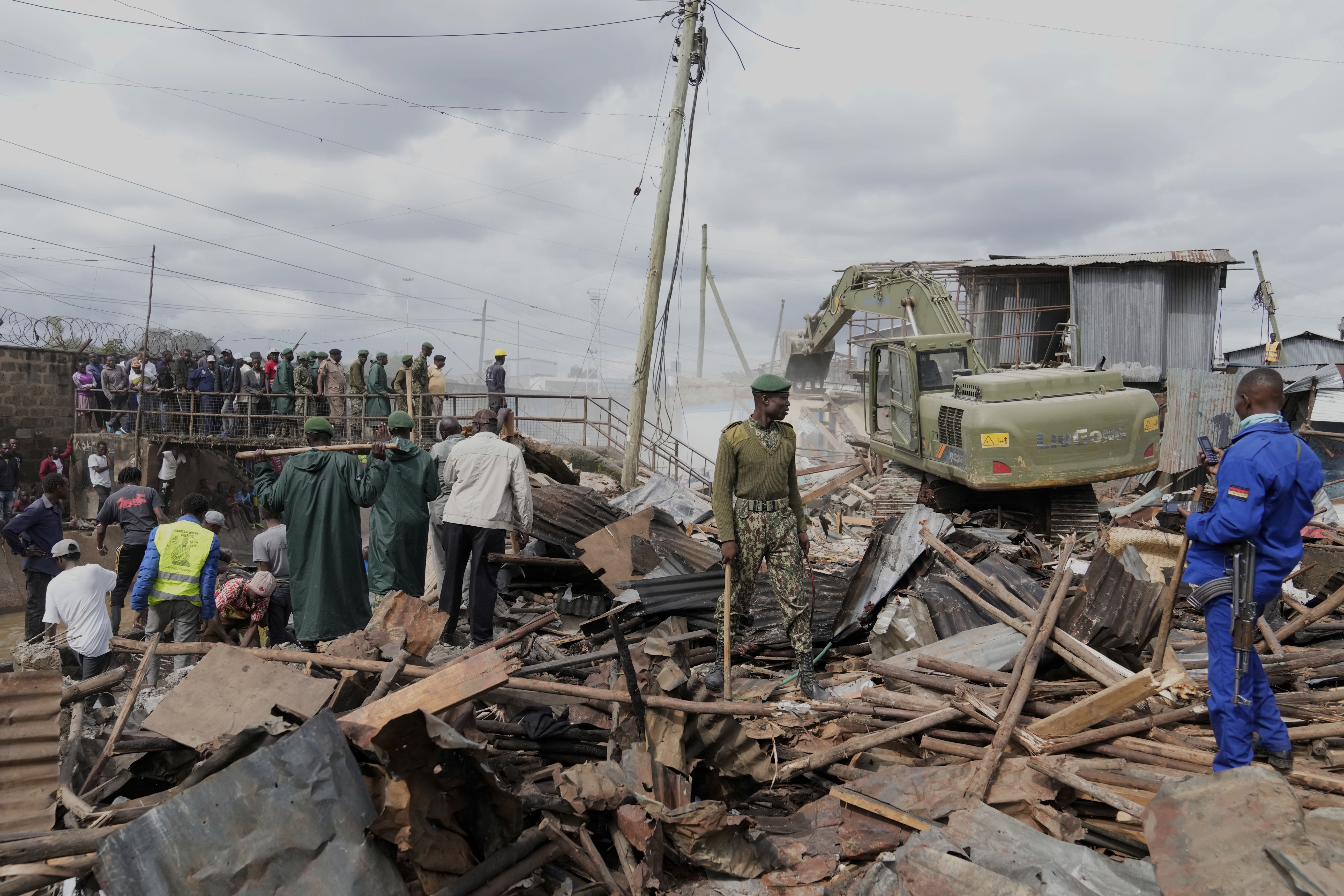 A bulldozer demolishes houses during a government ordered demolition of illegally constructed structures on riparian land in the Mukuru area of Nairobi, Kenya, Tuesday, May 7, 2024. (Photo by Brian Inganga/AP Photo)