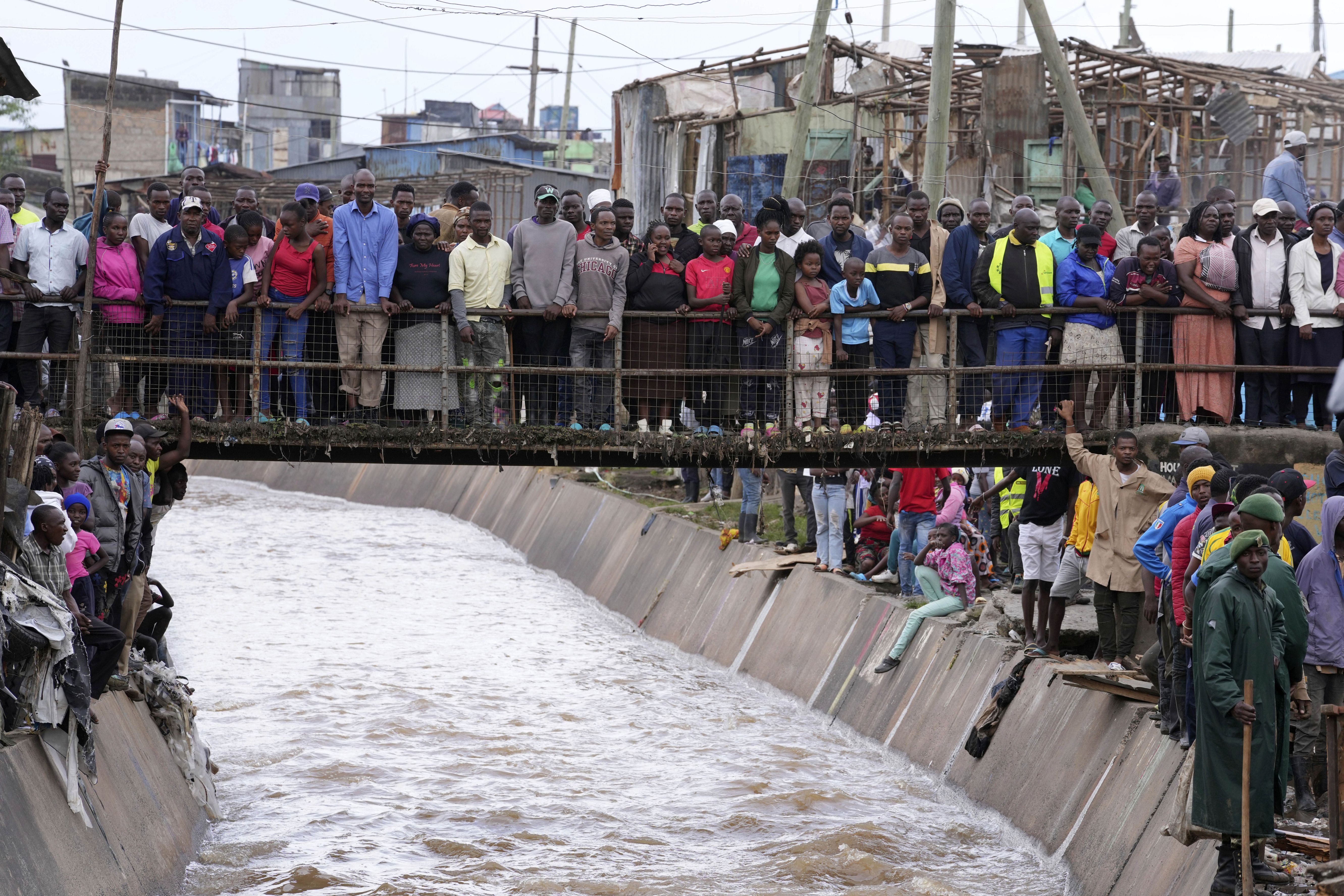People stand on a bridge, as they watch houses in riparian land being demolished in the Mukuru area of Nairobi, Tuesday, May. 7, 2024. The government ordered the demolition of structures and buildings, illegally constructed along riparian areas. Kenya, along with other parts of East Africa, has been overwhelmed by flooding. (Photo by Brian Inganga/AP Photo)