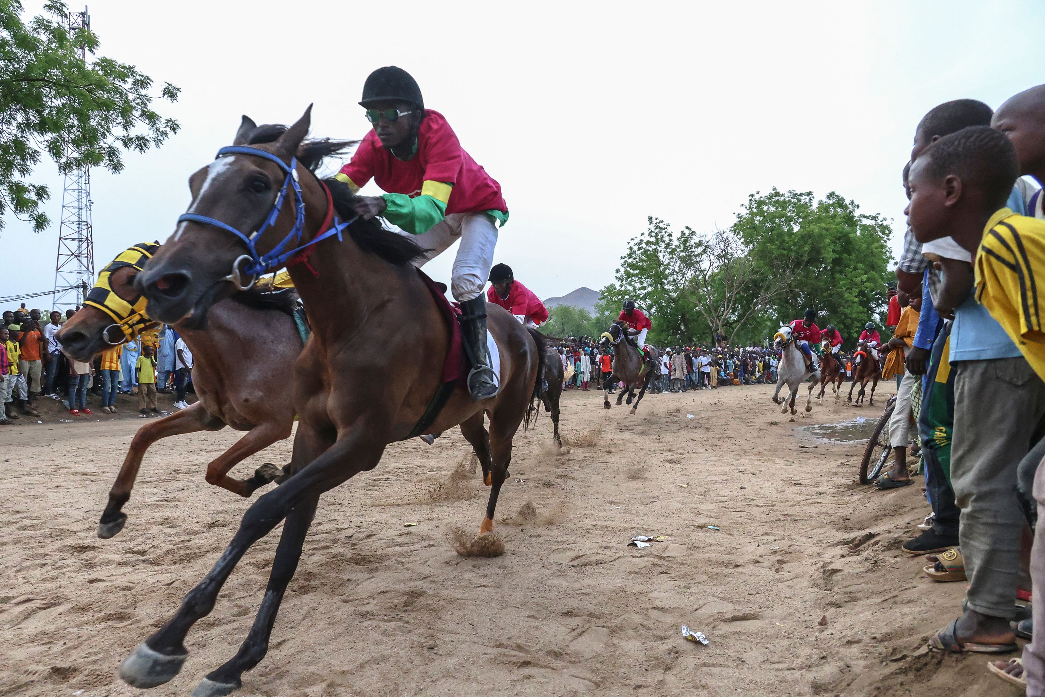 Jockeys (from Cameroon, Chad, Niger and Nigeria) on their horses react during the 12th edition of the Cameroon International Horse Race Grand Prix in Maroua, on May 11, 2024. (Photo by Daniel Beloumou Olomo/AFP Photo)