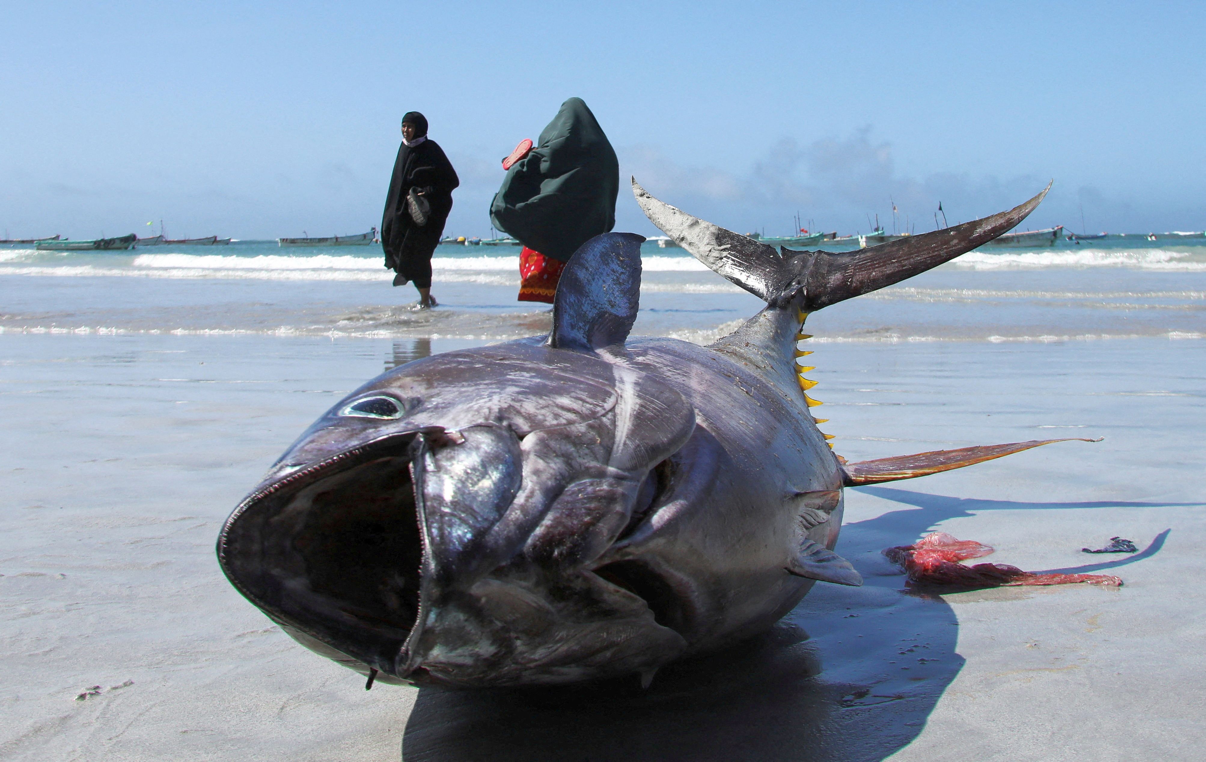 Somali women walk near a fish put on display by fishermen at the Liido beach in Mogadishu, Somalia on May 13, 2024. (Photo by Feisal Omar/Reuters)