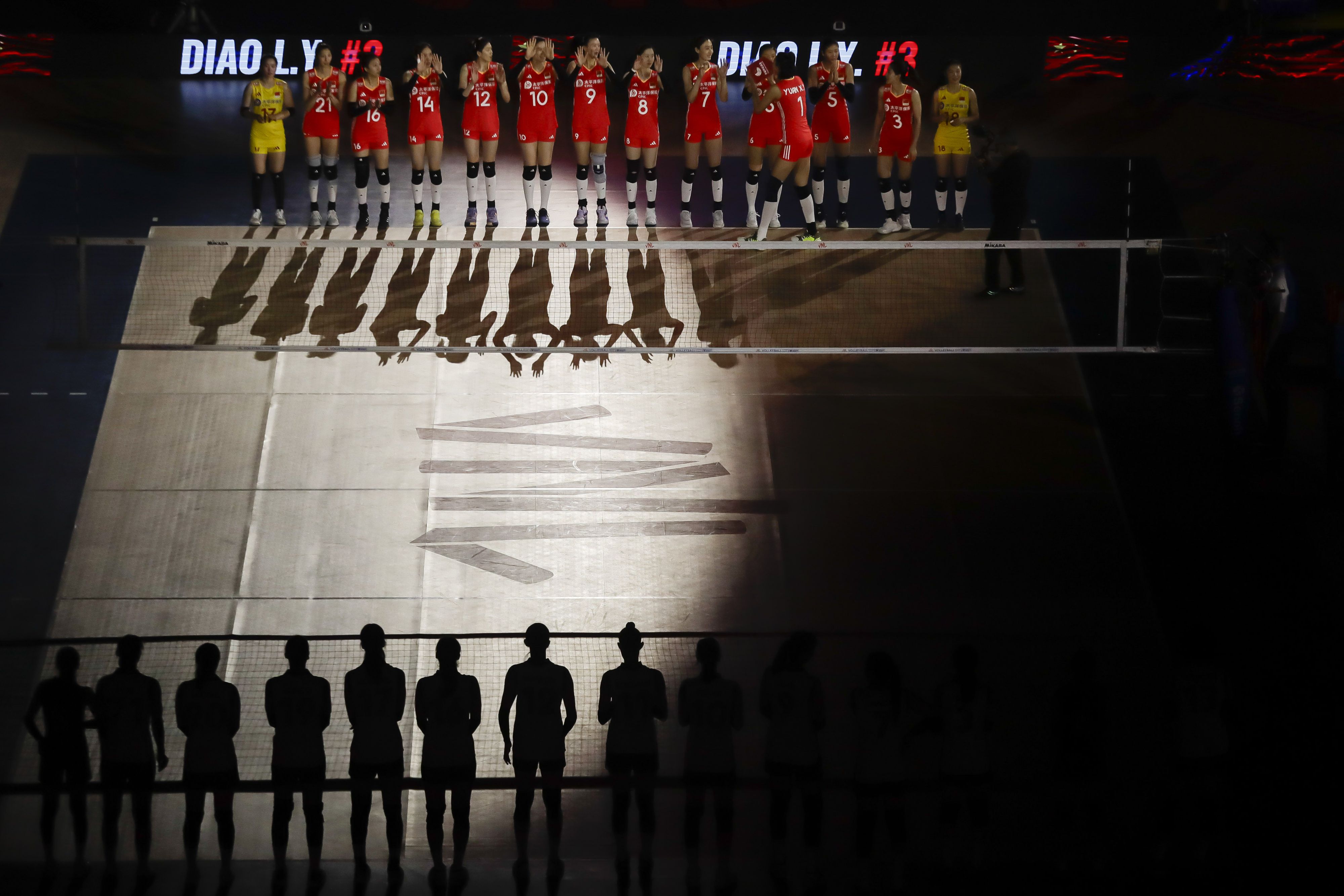 Chinese players, top, and South Korean players, line up at the start of their Volleyball Women's Nations League match, at the Maracanazinho stadium in Rio de Janeiro, Brazil, Tuesday, May 14, 2024. (Photo by Bruna Prado/AP Photo)