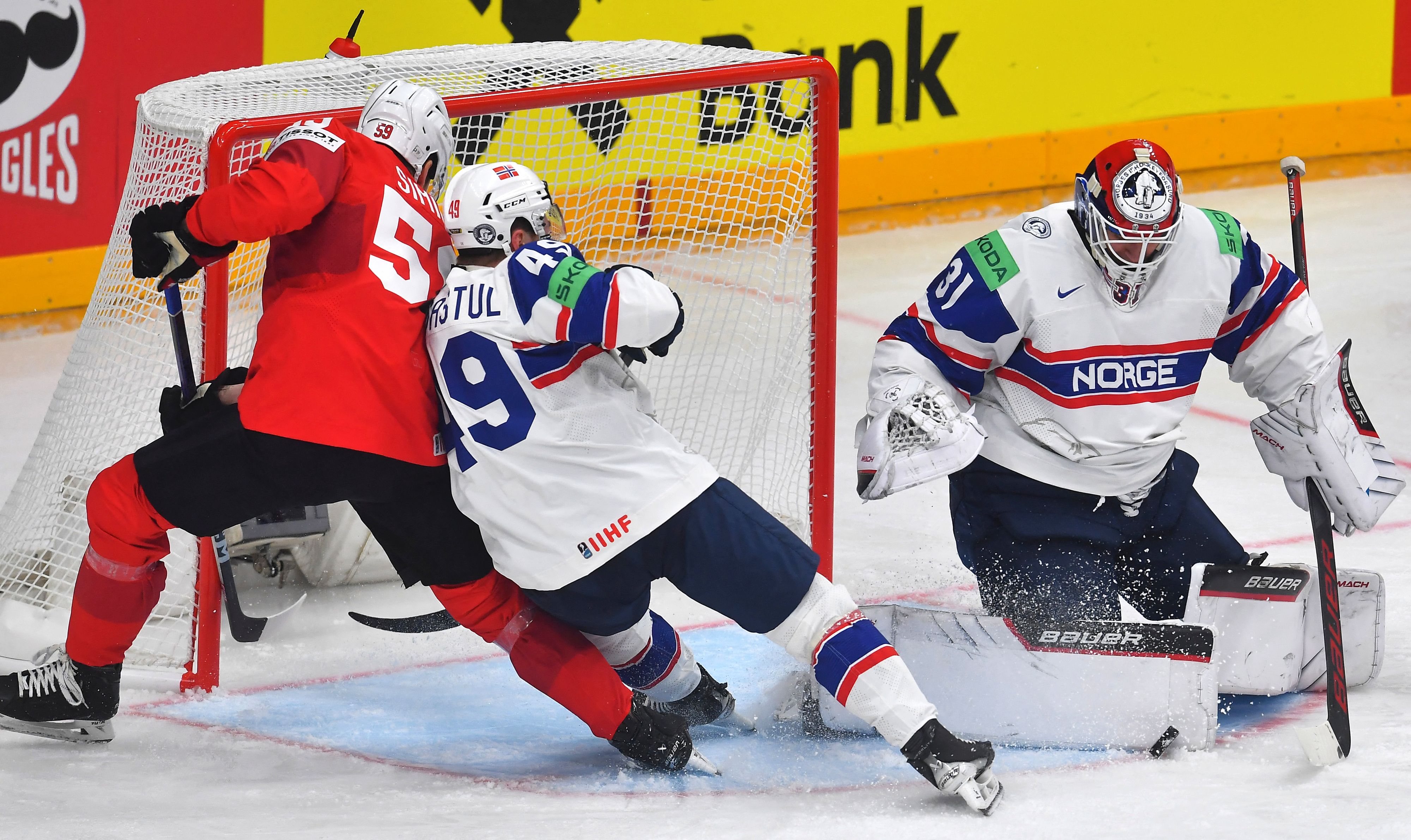 Switzerland's forward #59 Dario Simion (L) vies for a puck with Norway's defender #49 Christian Kasastul (C) and Norway's goalkeeper #31 Jonas Arntzen (R) during the IIHF Ice Hockey Men's World Championships match between Switzerland and Norway in Prague, Czech Republic on May 10, 2024. (Photo by Michal Cizek/AFP Photo)