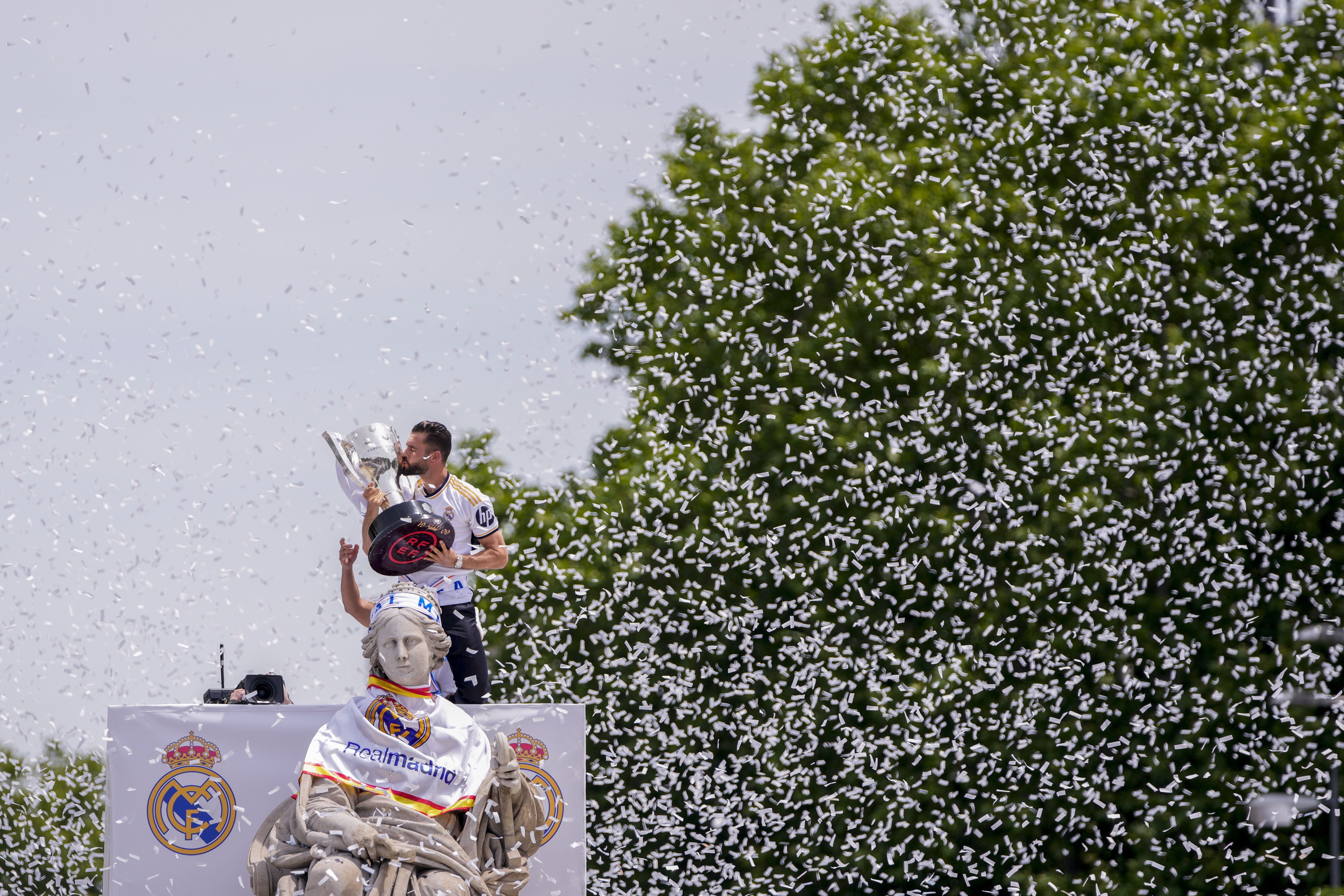 Real Madrid's Nacho Fernandez holds their 36th Liga trophy during celebrations at the Cibeles Square a week after clinching Spanish La Liga soccer title in Madrid, Sunday, May 12, 2024. (Photo by Manu Fernandez/AP Photo)
