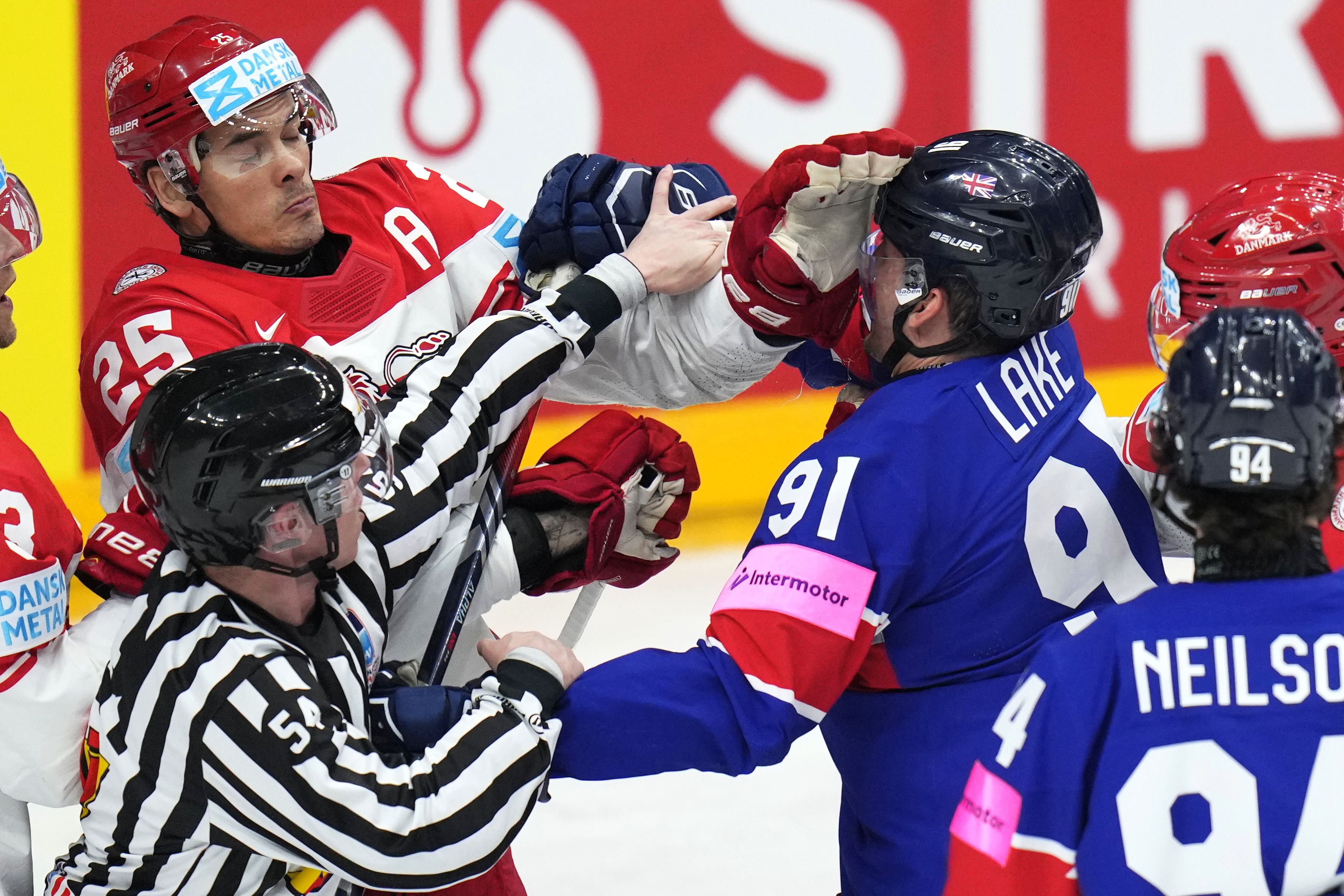 A referee tries to break up a fight between Denmark's Oliver Lauridsen, left, and Britain's Ben Lake during the preliminary round match between Great Britain and Denmark at the Ice Hockey World Championships in Prague, Czech Republic, Friday, May 17, 2024. (Photo by Petr David Josek/AP Photo)
