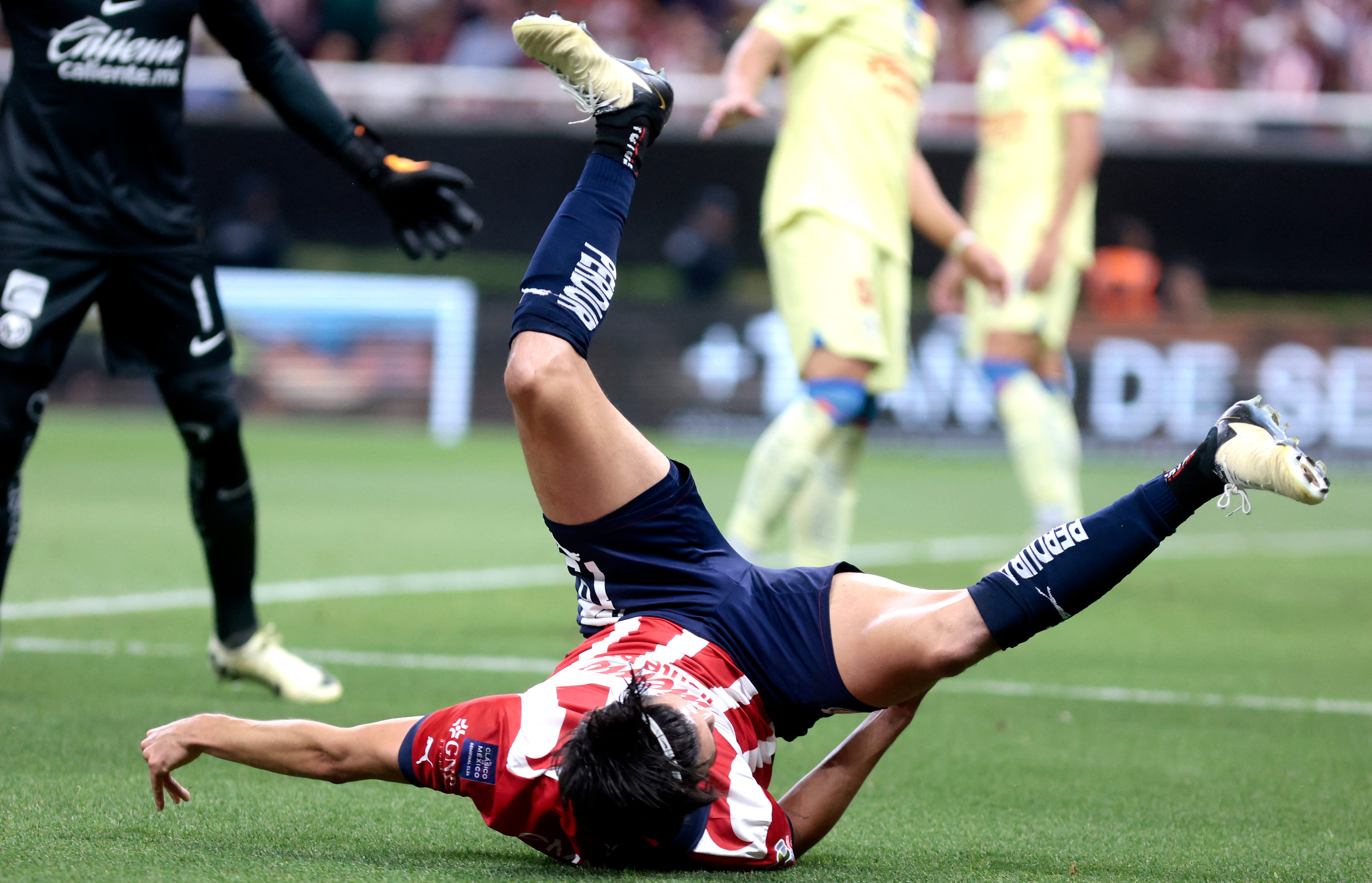 Guadalajara's forward Ricardo Marin gestures as he misses a shot on goal during the Mexican Clausura tournament semifinal first leg football match between Guadalajara and America at the Akron stadium in Guadalajara, Mexico, on May 15, 2024. (Photo by Ulises Ruiz/AFP Photo)