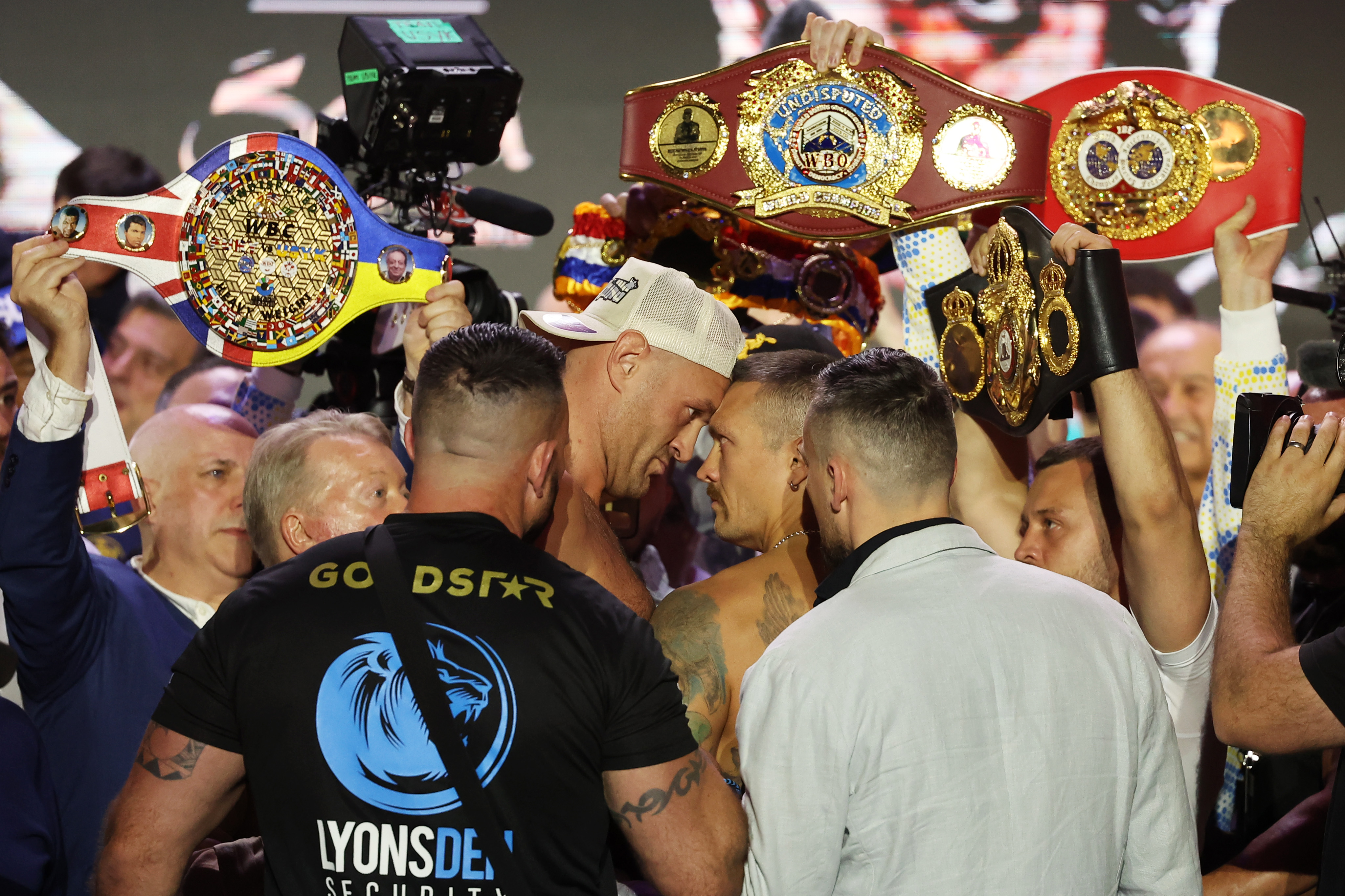 Tyson Fury and Oleksandr Usyk face off after weighing in ahead of the IBF, WBA, WBC and WBO heavyweight titles' fight between Tyson Fury and Oleksandr Usyk during the Ring Of Fire Official weigh-in at BLVD City - Music World on May 17, 2024 in Riyadh, Saudi Arabia. (Photo by Richard Pelham/Getty Images)