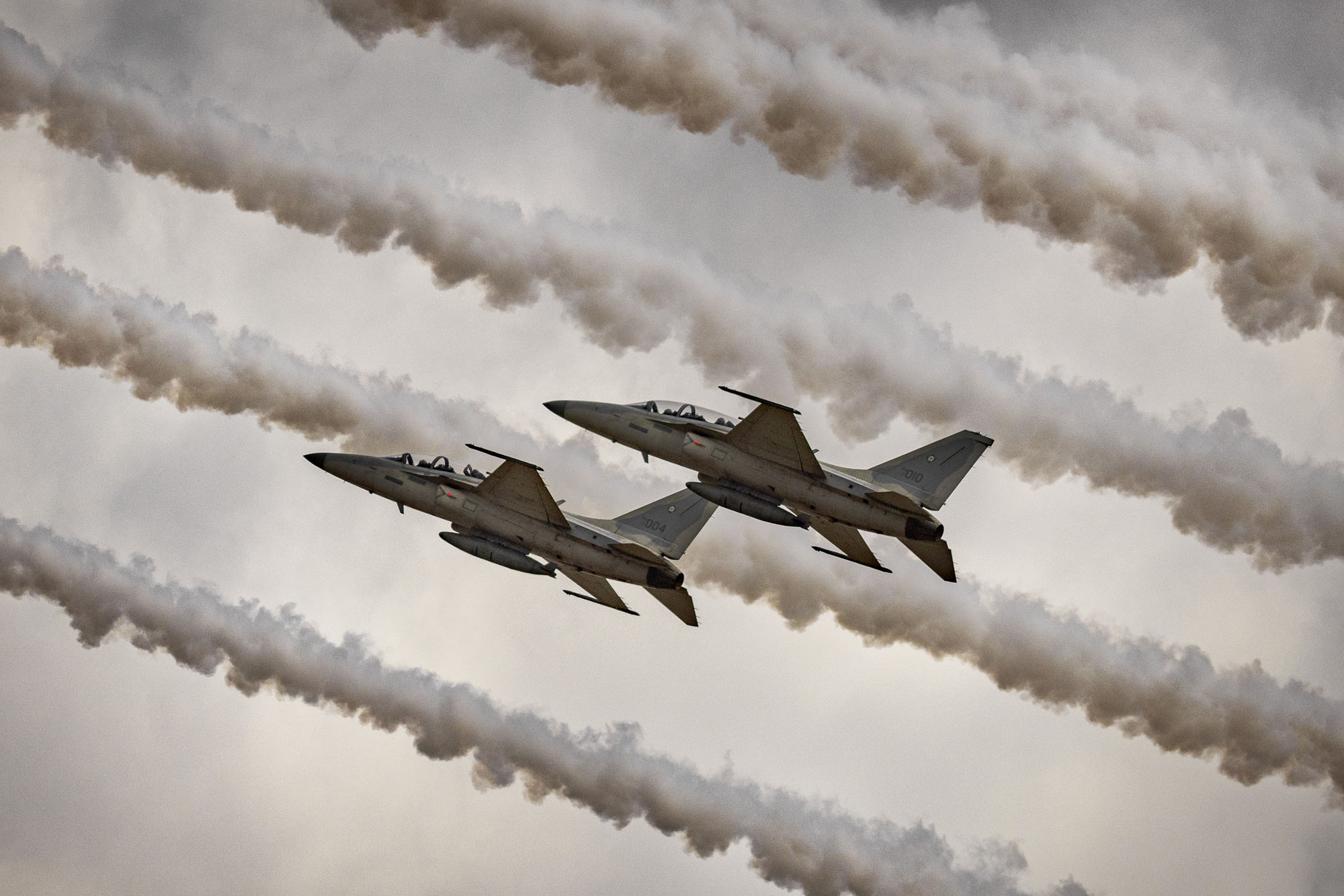 Philippine Air Force pilots maneuver FA-50PH fighter jets as they perform an air show with the Republic of Korea Air Force's (ROKAF) aerobatic unit “Black Eagles” on March 03, 2024 in Pampanga, Philippines. The Republic of Korea Air Force's (ROKAF) aerobatic unit “Black Eagles” is in the Philippines to conduct a series of air shows to mark the 75th anniversary of diplomatic relations between the Philippines and South Korea. (Photo by Ezra Acayan/Getty Images)