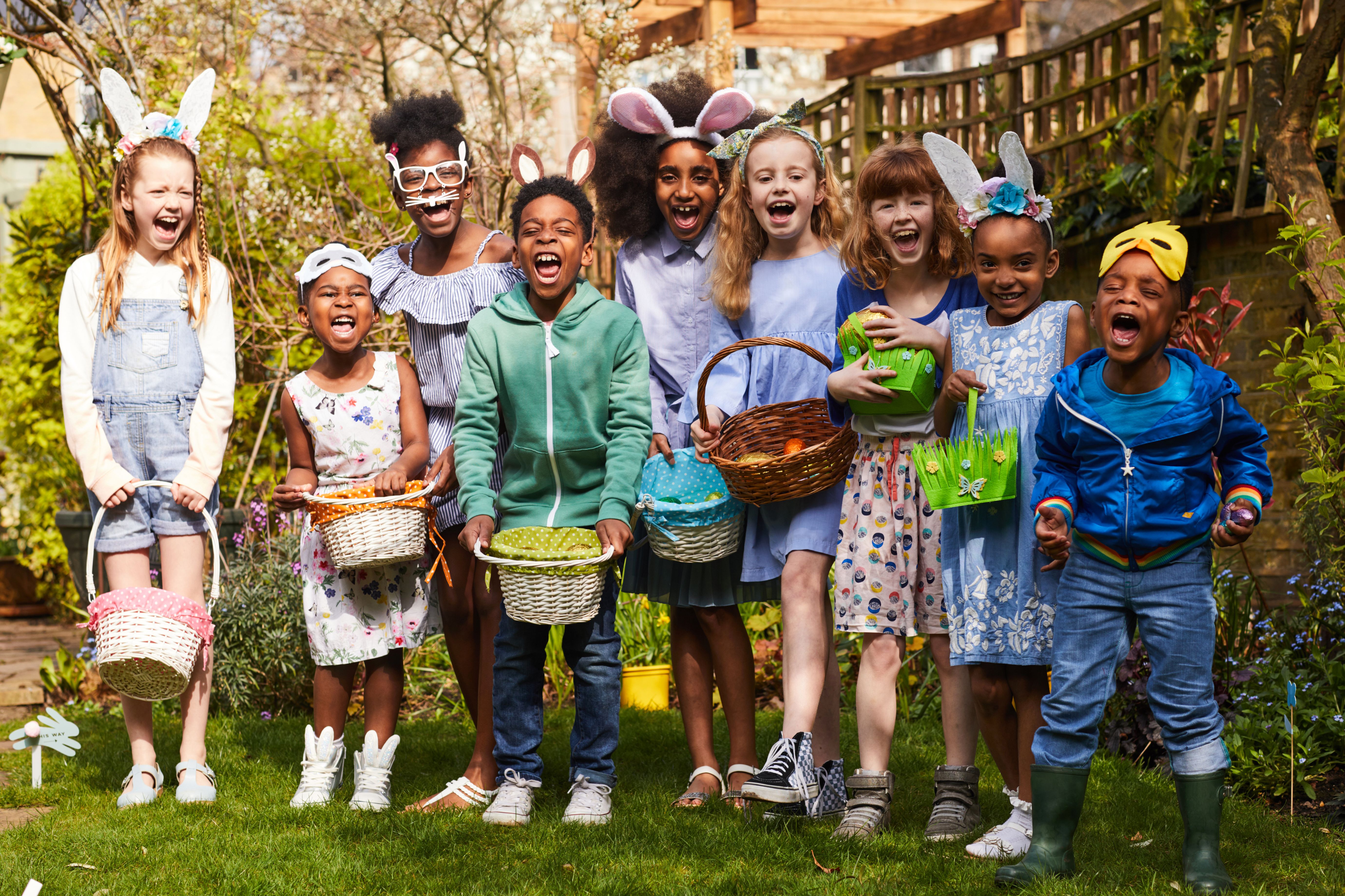 Group of children having fun on an Easter Egg Hunt, laughing and shouting, outside in the sun. (Photo by Looks Like Me/Getty Images)