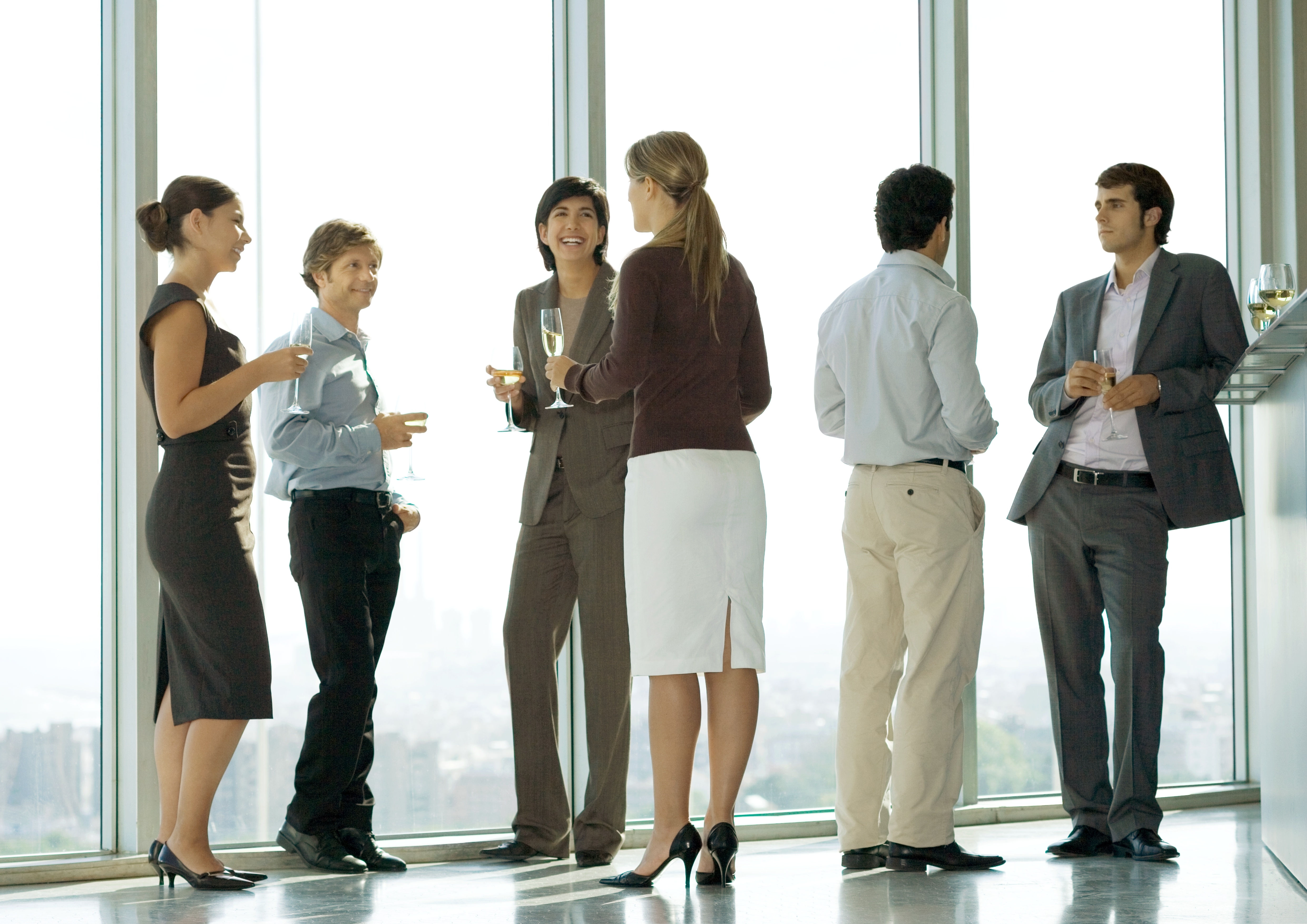 People standing with glasses during office party. (Photo by Frederic Cirou/Getty Images)