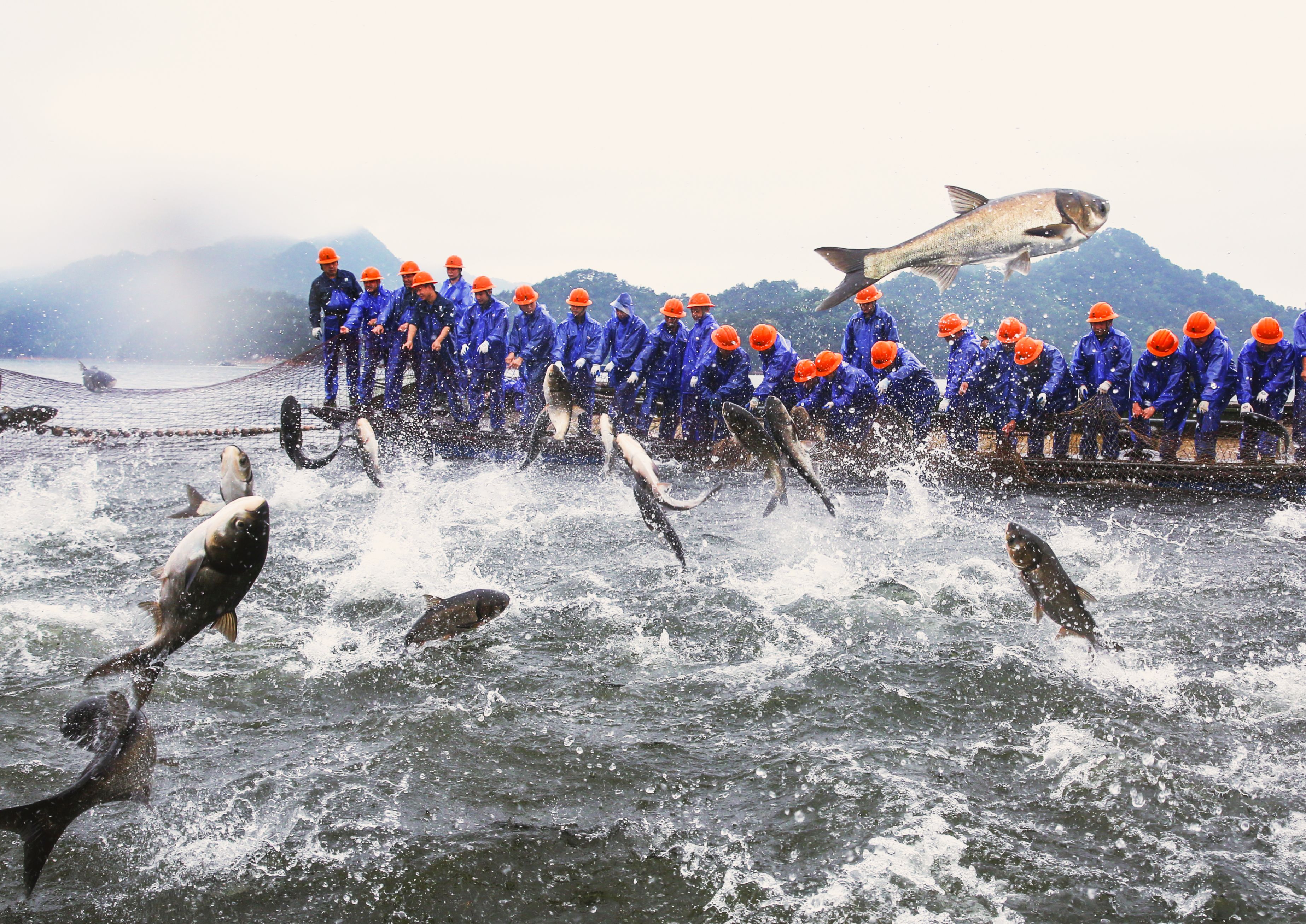 Fishermen harvest fish with a giant net on the Qiandao Lake on May 7, 2024 in Chun an County, Hangzhou City, Zhejiang Province of China. (Photo by VCG/VCG via Getty Images)