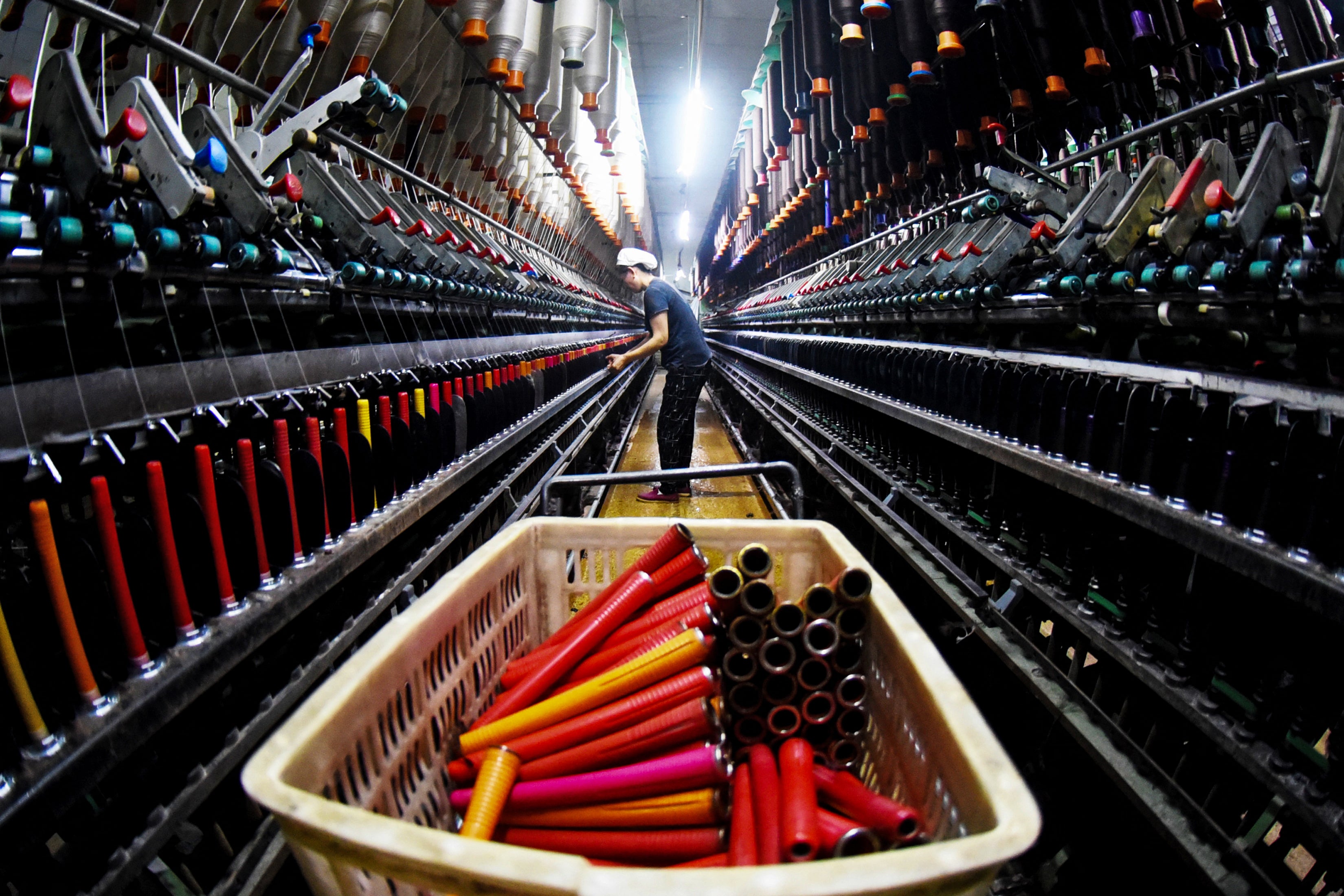 An employee works at a textile factory in Lianyungang, in eastern China's Jiangsu province on May 17, 2024. (Photo by AFP Photo/China Stringer Network)
