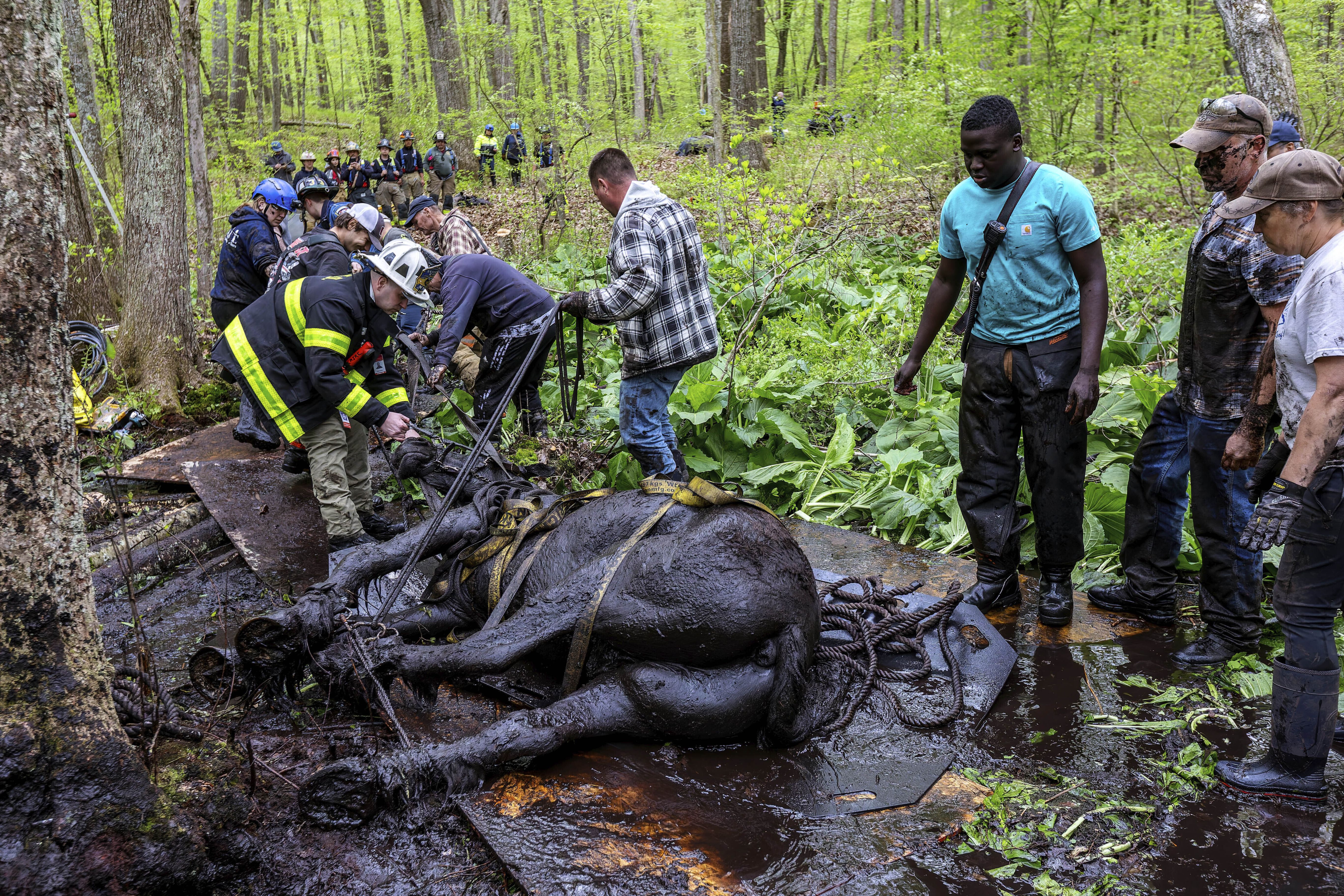 This image provided by Thomas J. Nanos shows LVFD, DART, and North Windham Volunteer Fire Department members working to bring the second horse out of the swamp in Lebanon, Conn., Saturday, May 11, 2024. Two horses stuck deep in mud for hours were pulled out by more than a dozen rescuers. (Photo by Thomas J. Nanos via AP Photo)