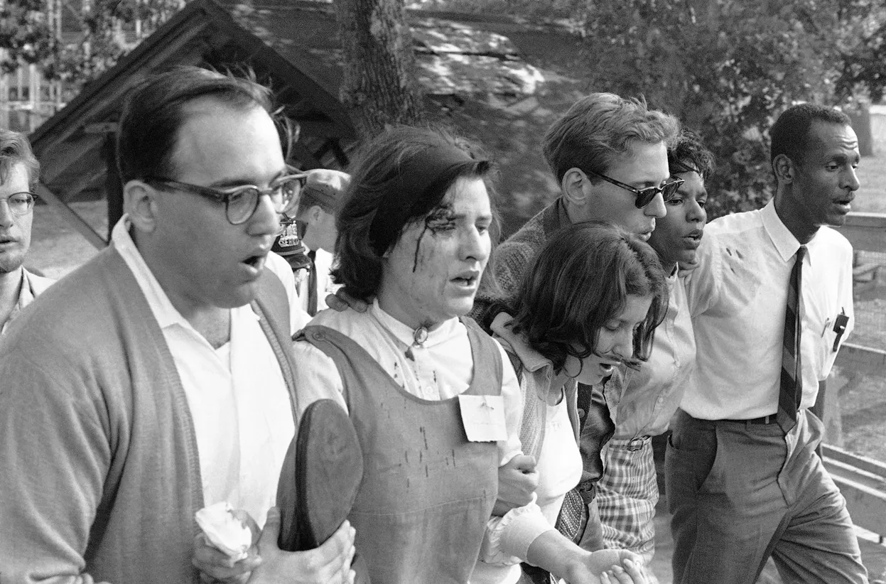 Allison Turaj, 25, of Washington, D.C., blood running down her cheek, was cut over her right eye by a thrown rock in a mass demonstration at a privately owned, segregated amusement park in suburban Woodlawn in Baltimore, on July 7, 1963. (Photo by AP Photo)