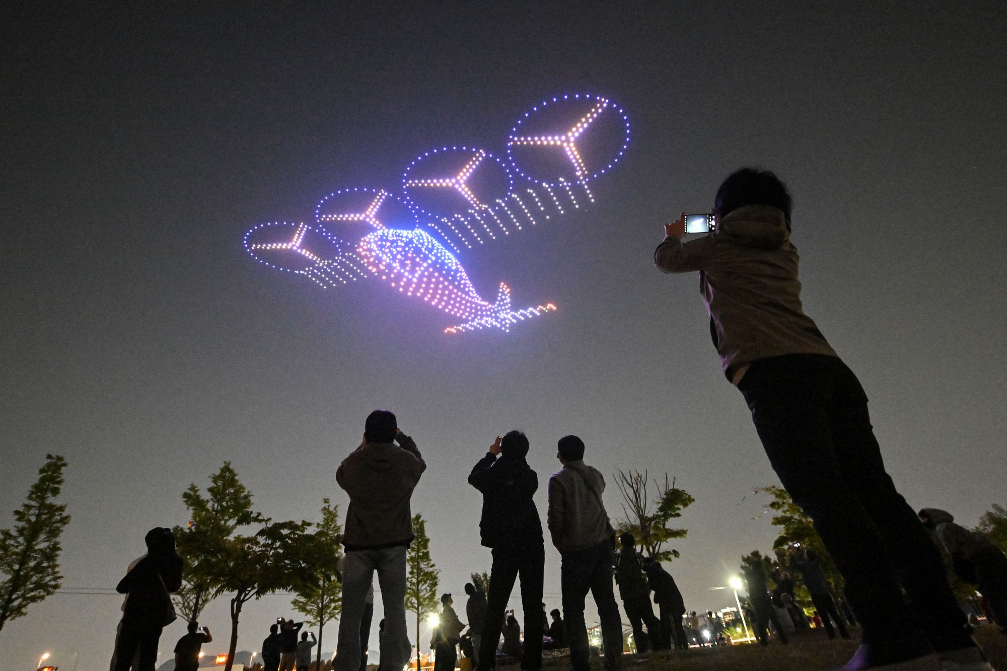 A swarm of 1,000 drones forms patterns in the night sky during a drone light show as part of the 2024 Korea Drone Expo in Incheon on May 9, 2024. (Photo by Jung Yeon-je/AFP Photo)