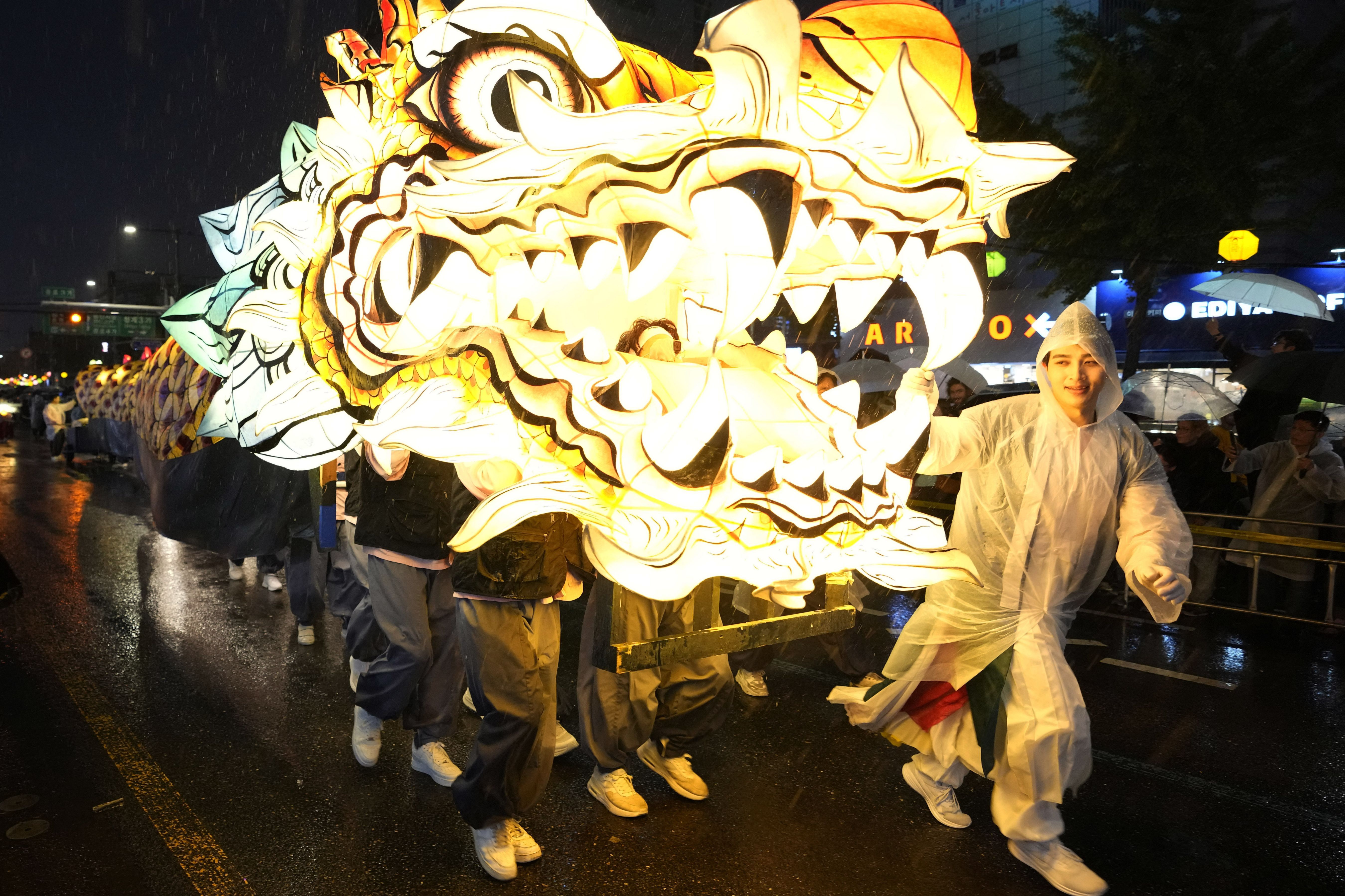 Buddhists walk with a giant lantern in the share of a dragon during the Lotus Lantern Festival, ahead of the birthday of Buddha at Dongguk University in Seoul, South Korea, Saturday, May 11, 2024. (Photo by Ahn Young-joon/AP Photo)