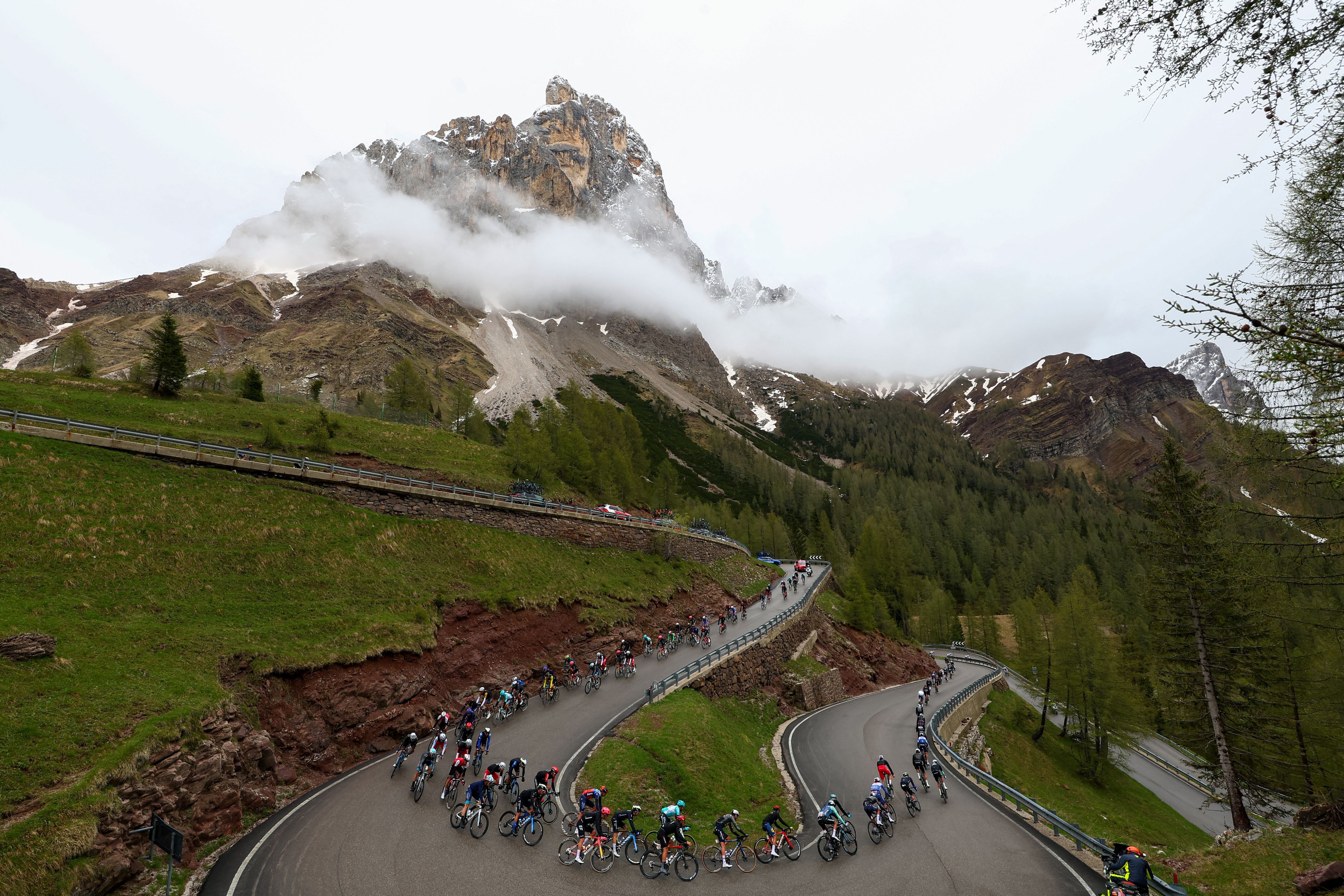 The pack rides a downhill curve in Passo Rolle during the 17th stage of the 107th Giro d'Italia cycling race, 159km between Selva di Val Gardena and Passo del Brocon on May 22, 2024. (Photo by Luca Bettini/AFP Photo)