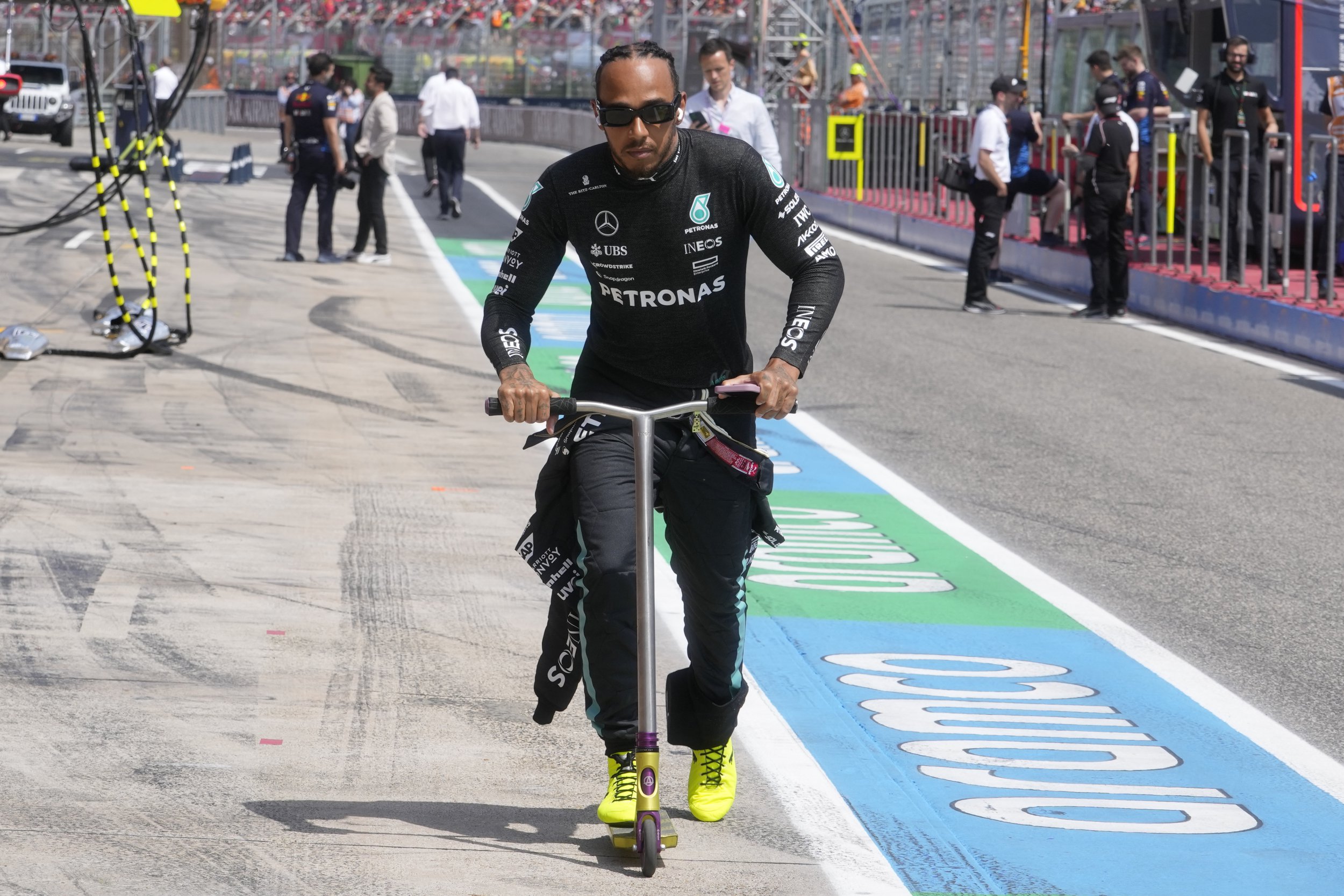 Mercedes' British driver Lewis Hamilton rides an electric scooter ahead of the Emilia Romagna Formula One Grand Prix at the Autodromo Enzo e Dino Ferrari race track in Imola on May 19, 2024. (Photo by Luca Bruno/AFP Photo)