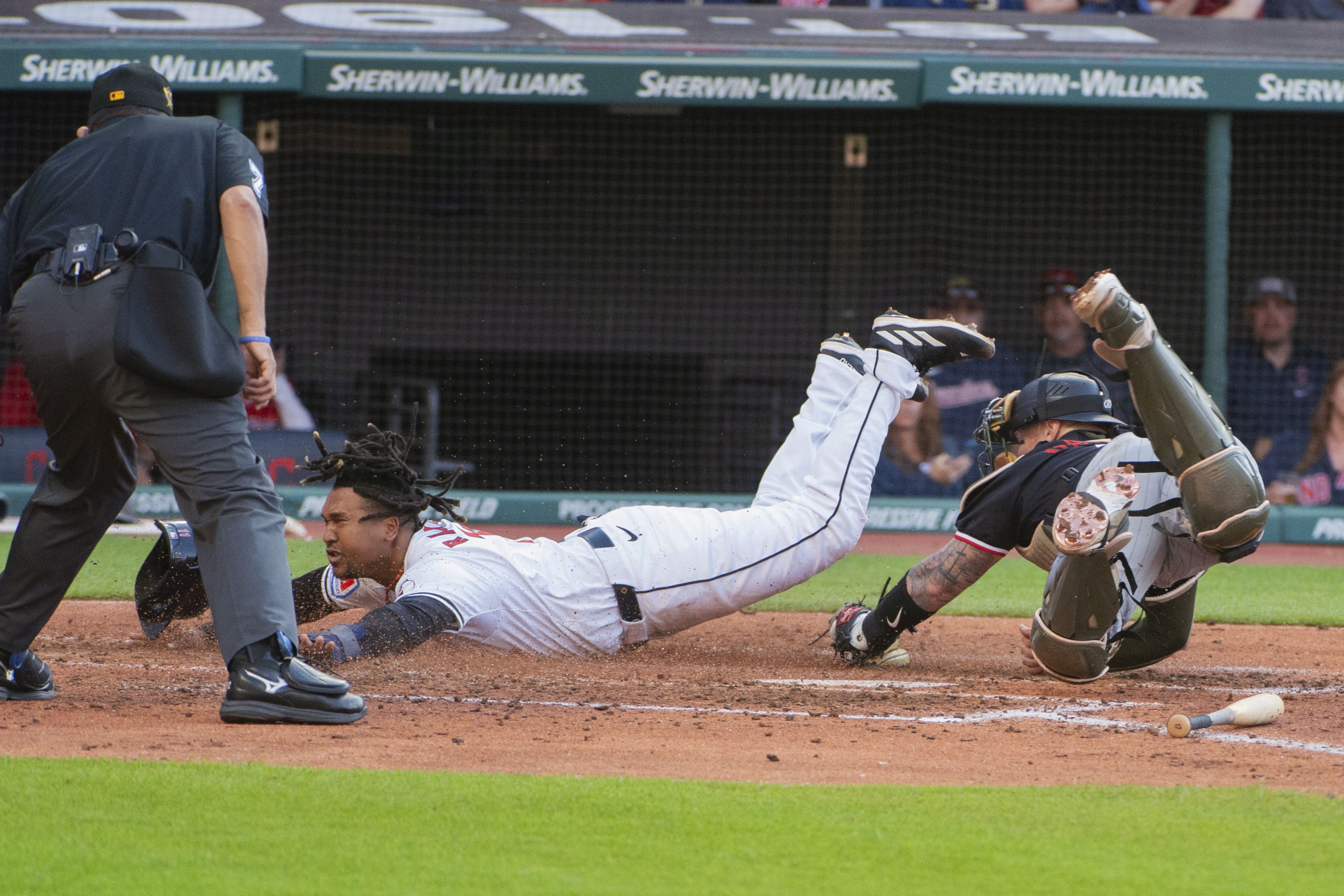 Minnesota Twins' Christian Vazquez, right, tags out Cleveland Guardians' Jose Ramírez at home as umpire Alfonso Marquez, left, watches during the third inning of a baseball game in Cleveland, Saturday, May 18, 2024. (Photo by Phil Long/AP Photo)