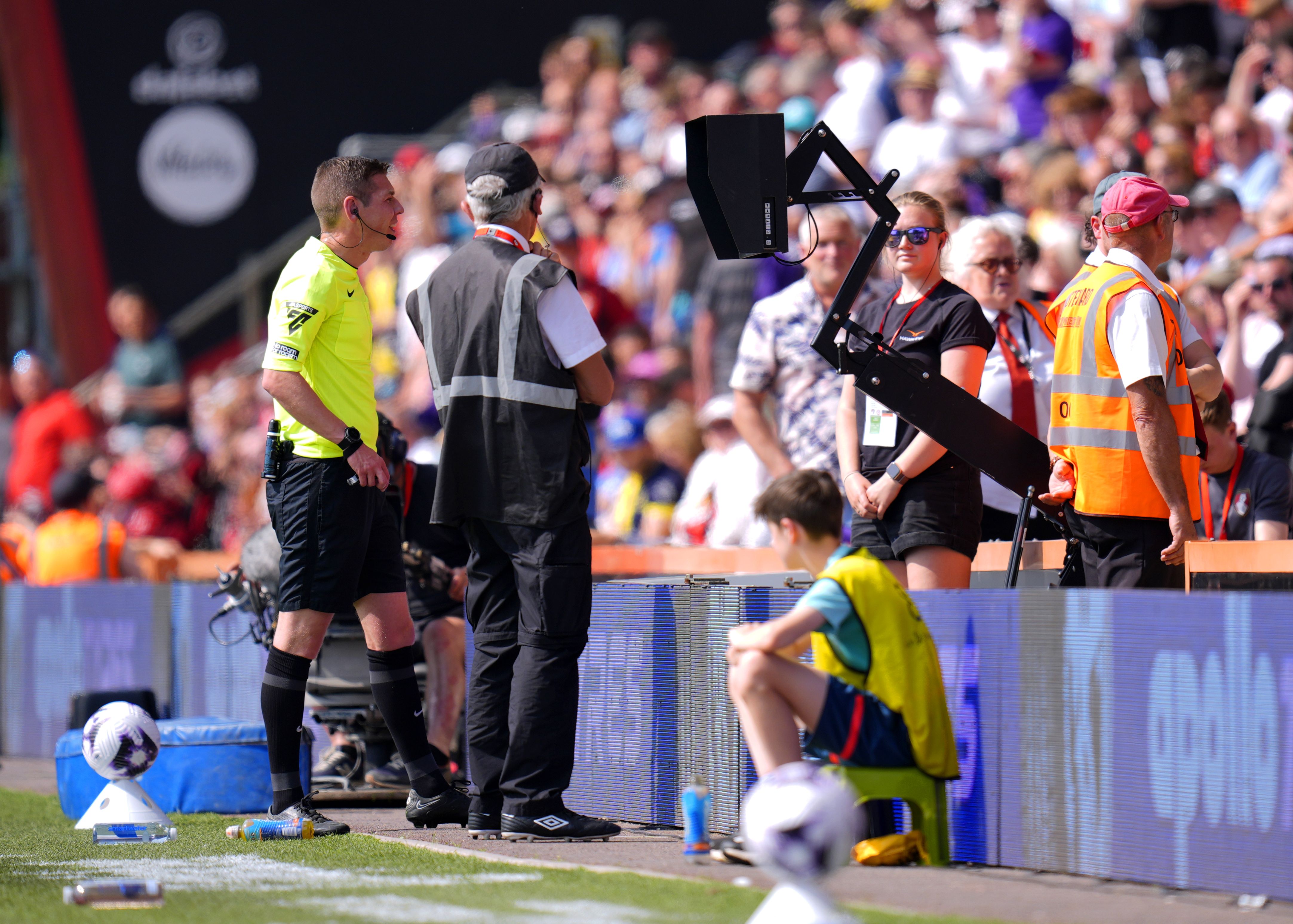 Referee Matt Donohue checks the VAR screen before overturning a decision to award a penalty to Brentford during the Premier League match at the Vitality Stadium, London on Saturday, May 11, 2024. (Photo by Andrew Matthews/PA Images via Getty Images)