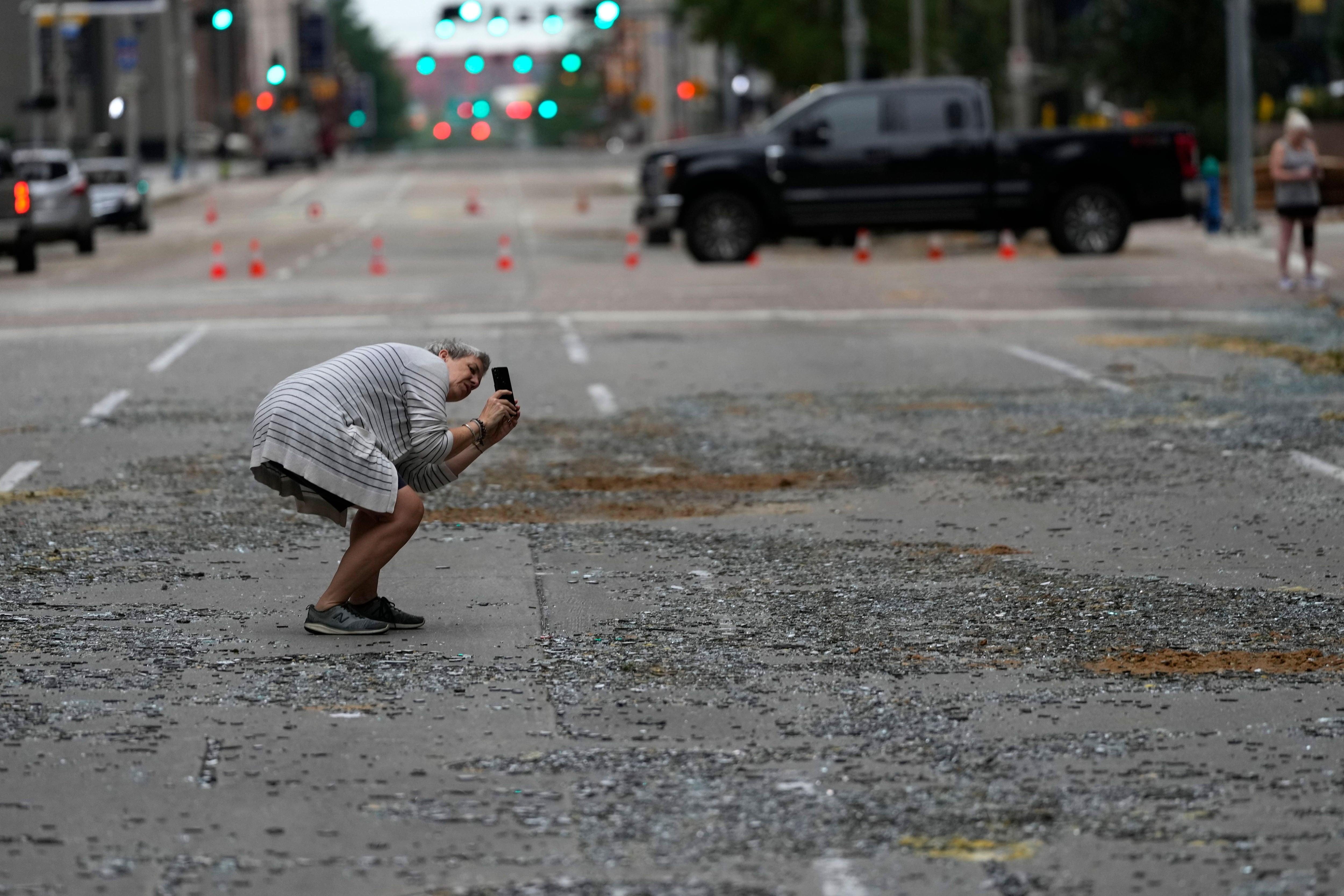 Cherly Herpich takes a photograph of a downtown building with blown out window in the aftermath of a severe thunderstorm Friday, May 17, 2024, in Houston. Thunderstorms pummeled southeastern Texas on Thursday killing at least four people, blowing out windows in high-rise buildings and knocking out power to more than 900,000 homes and businesses in the Houston area. (Photo by David J. Phillip/AP Photo)