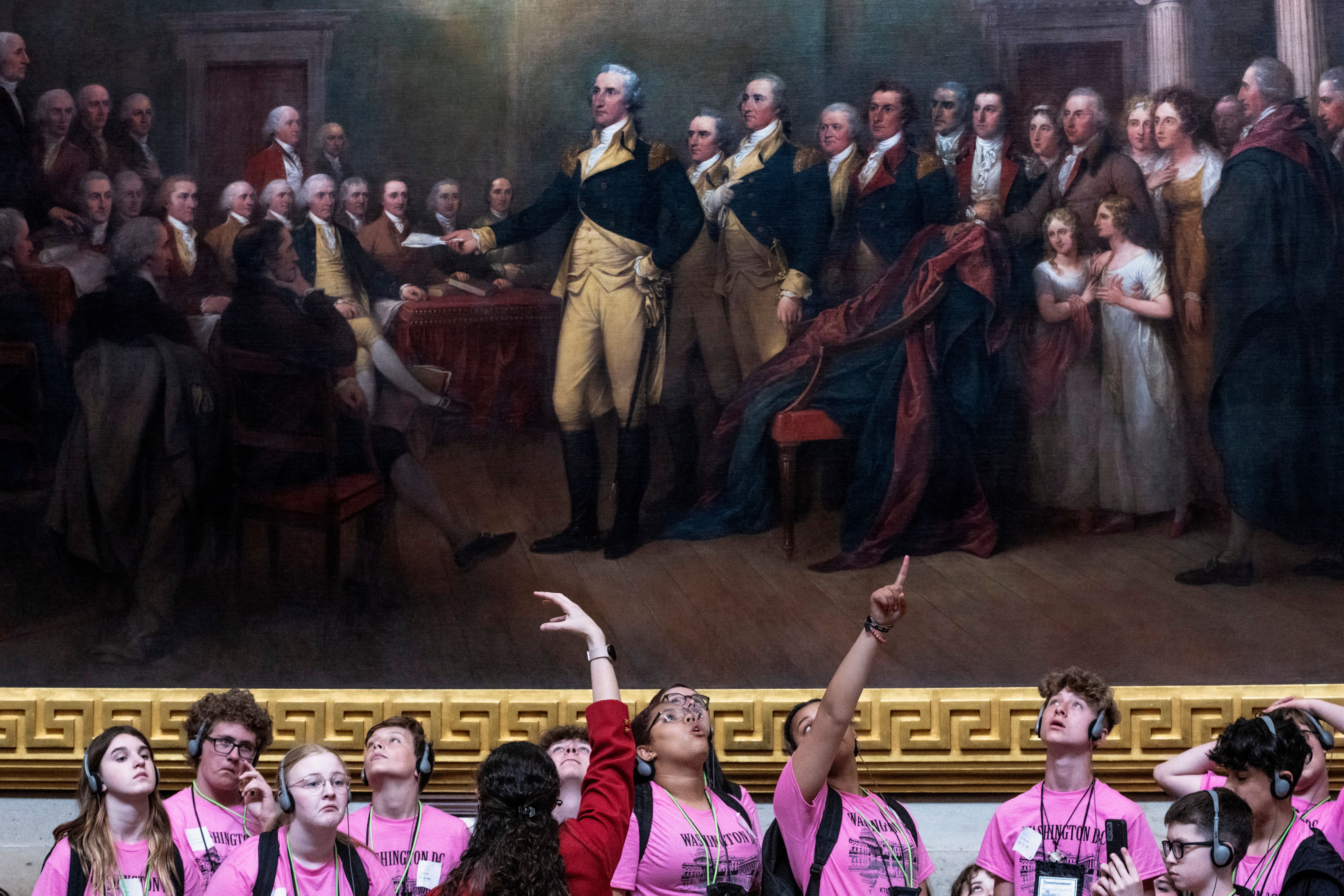 Students stand next to a John Trumbull painting of General George Washington resigning as Commander-in-Chief of the Continental Army in 1783 during a visit to the Capitol in Washington, DC, May 16, 2024. The United States Capitol building features a central rotunda below the Capitol dome where large oil paintings depicting important events in the History of the US are displayed. (Photo by Roberto Schmidt/AFP Photo)
