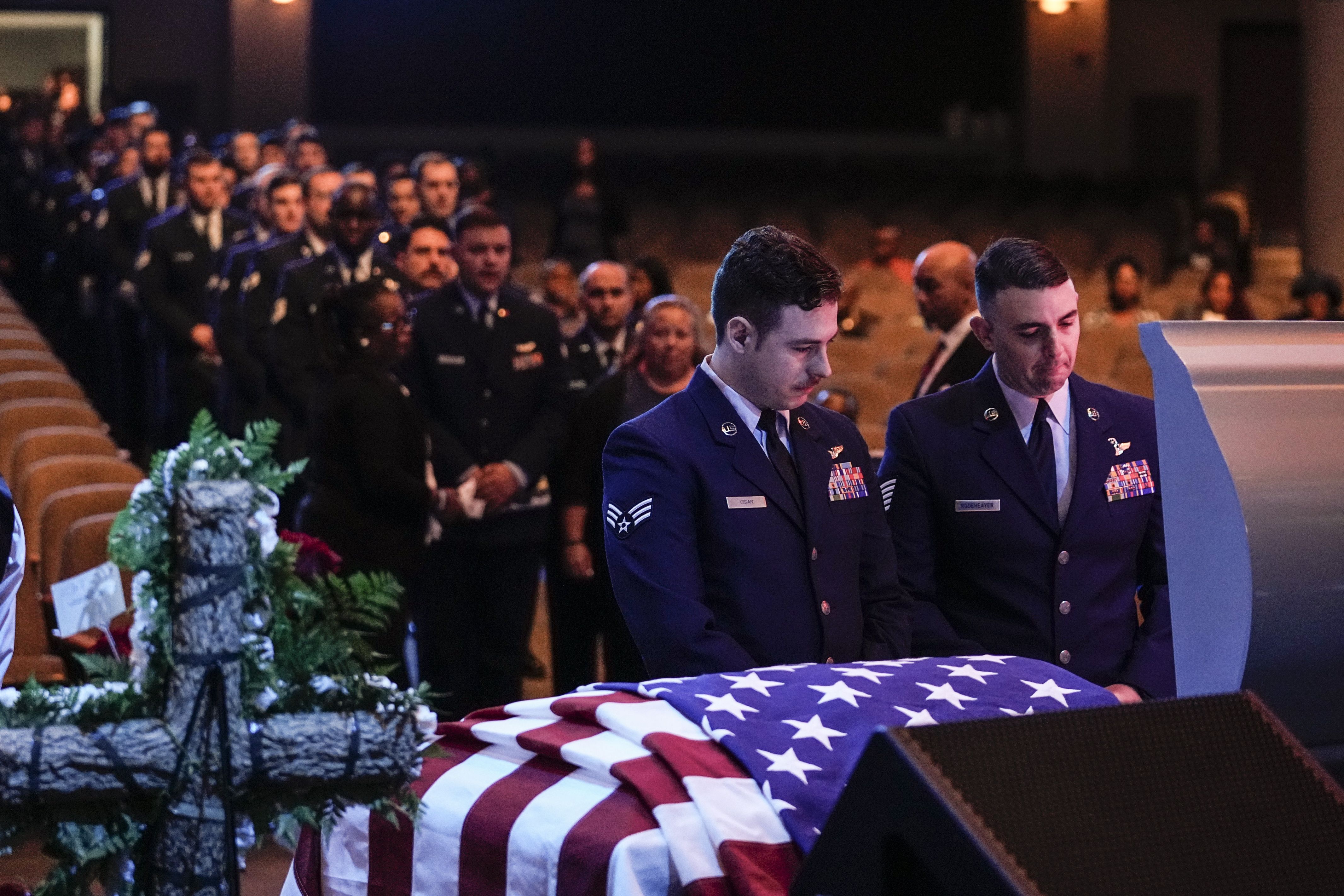 U.S. Air Force personel stand near the coffin of slain airman Roger Fortson during his funeral at New Birth Missionary Baptist Church, Friday, May 17, 2024, near Atlanta. (Photo by Brynn Anderson/AP Photo)