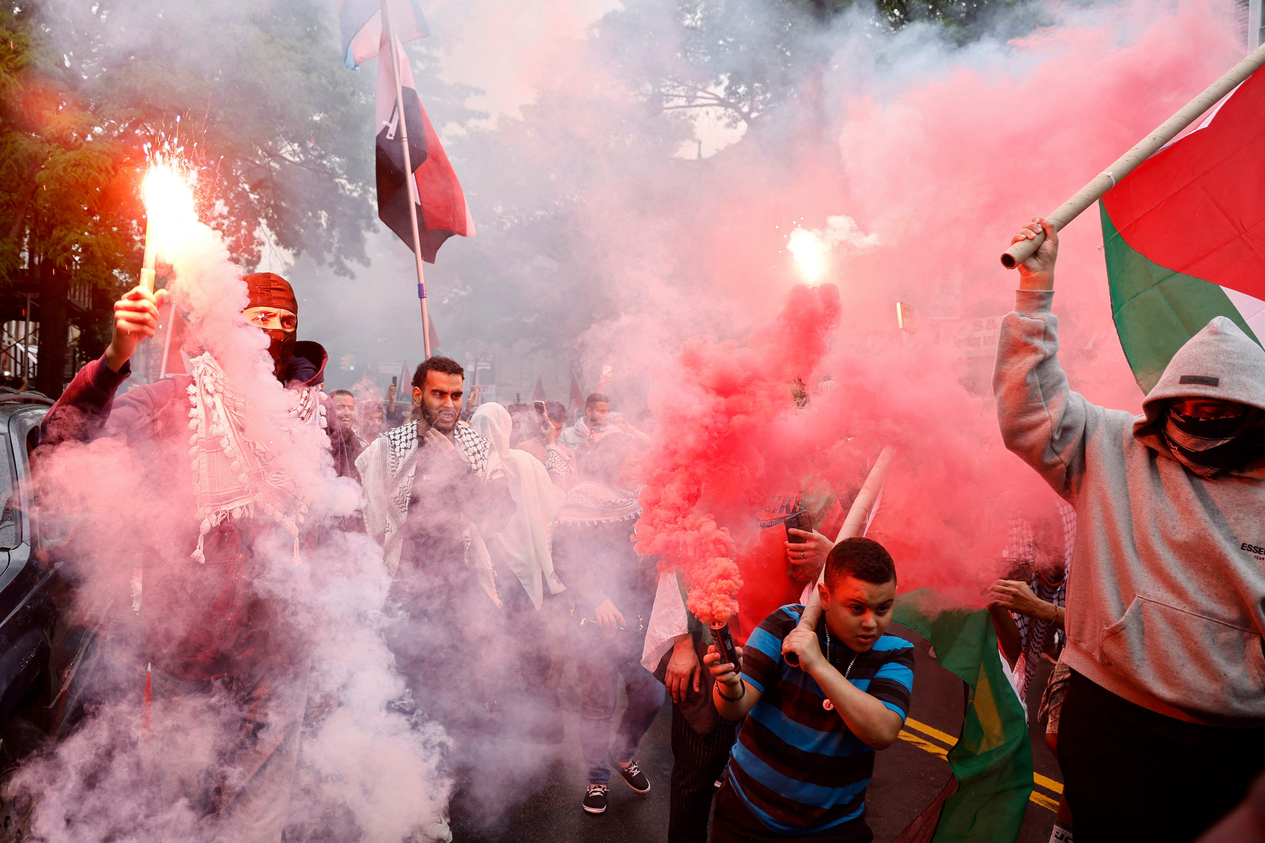 Pro-Palestinian demonstrators light flares as they rally to mark the Nakba anniversary in New York City on May 18, 2024. On May 15, 2024 and continuing this weekend, Palestinians and their supporters around the world marked the 76th anniversary of the “Nakba”, when around 760,000 Palestinians fled or were driven from their homes during the 1948 creation of Israel. (Photo by John Lamparski/AFP Photo)