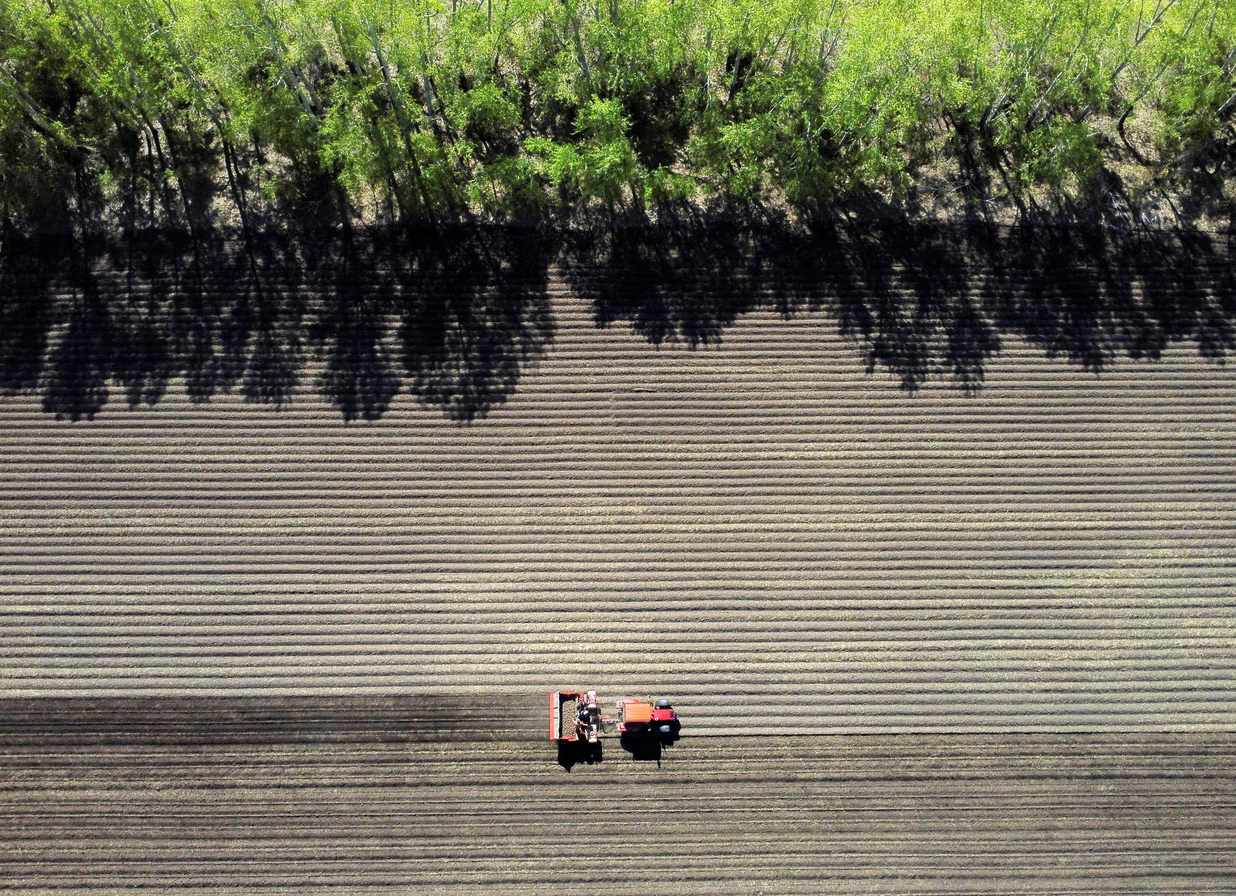 A drone view shows a tractor during potato planting in a field of the agricultural enterprise Sovkhoz Morskoi near the village of Leninskoye in the Novosibirsk region, Russia on May 17, 2024. (Photo by Vladislav Nekrasov/Reuters)