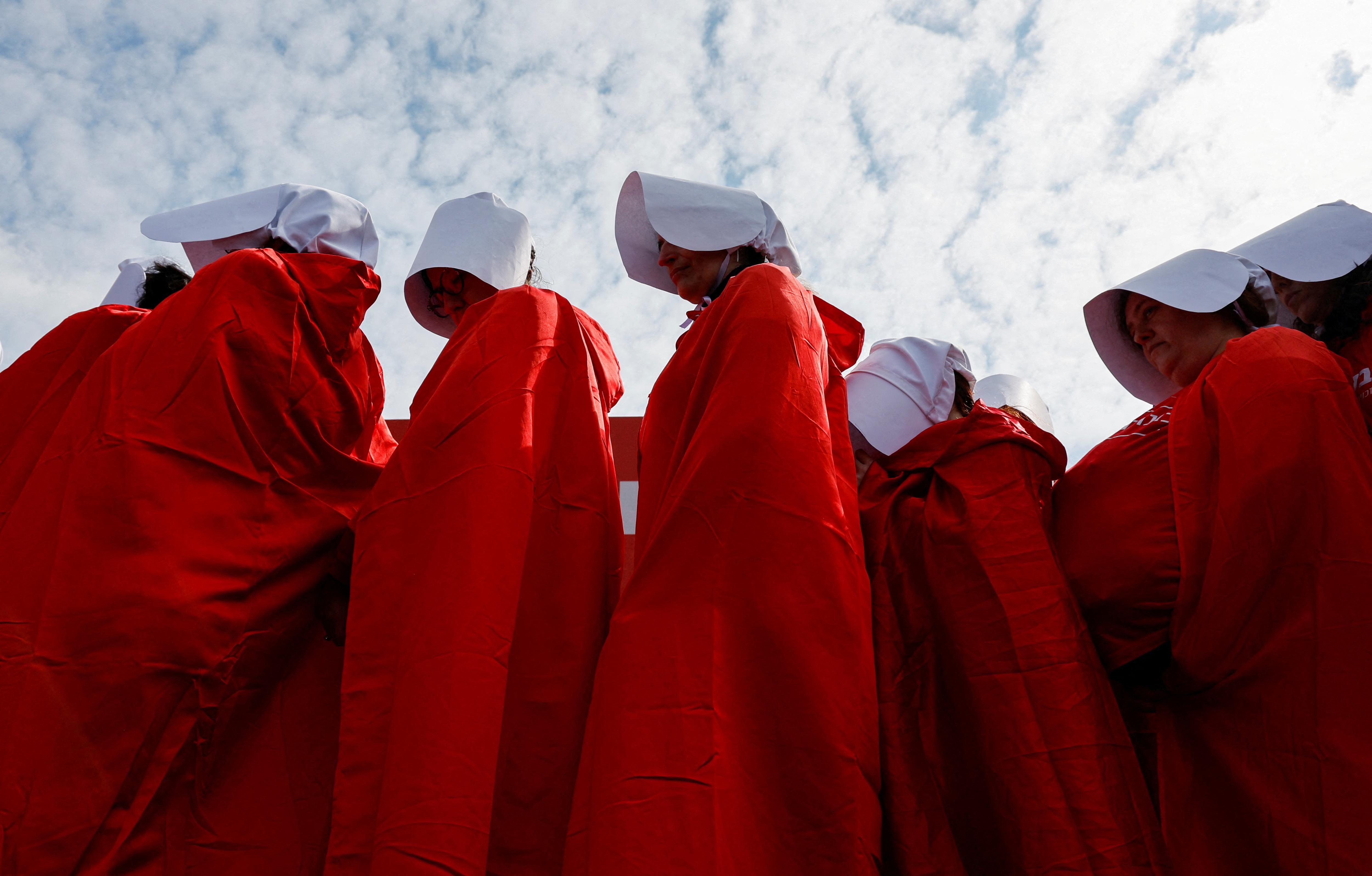 Israeli women wearing red capes demonstrate on the day Israel's constitution committee is set to start voting on changes that would give politicians more power on selecting judges while limiting Supreme Court's powers to strike down legislation, outside the Knesset, Israel's parliament in Jerusalem on February 13, 2023. (Photo by Ammar Awad/Reuters)