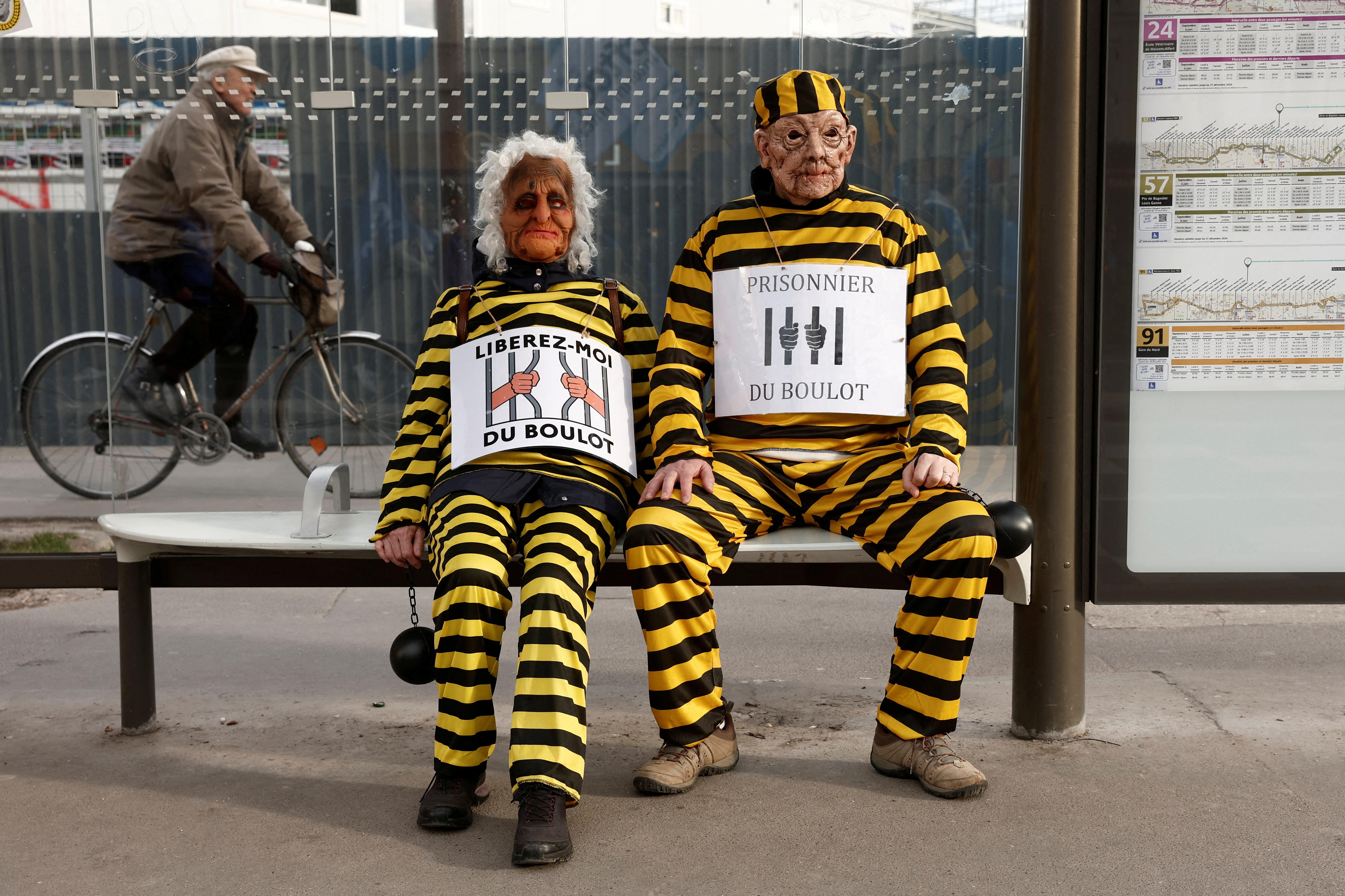 Protesters dressed in mock prison outfits attend a demonstration against French government's pension reform plan in Paris as part of the fifth day of national strike and protests in France on February 16, 2023. The slogans read "Free me from work" and “prisoner of work”. (Photo by Benoit Tessier/Reuters)