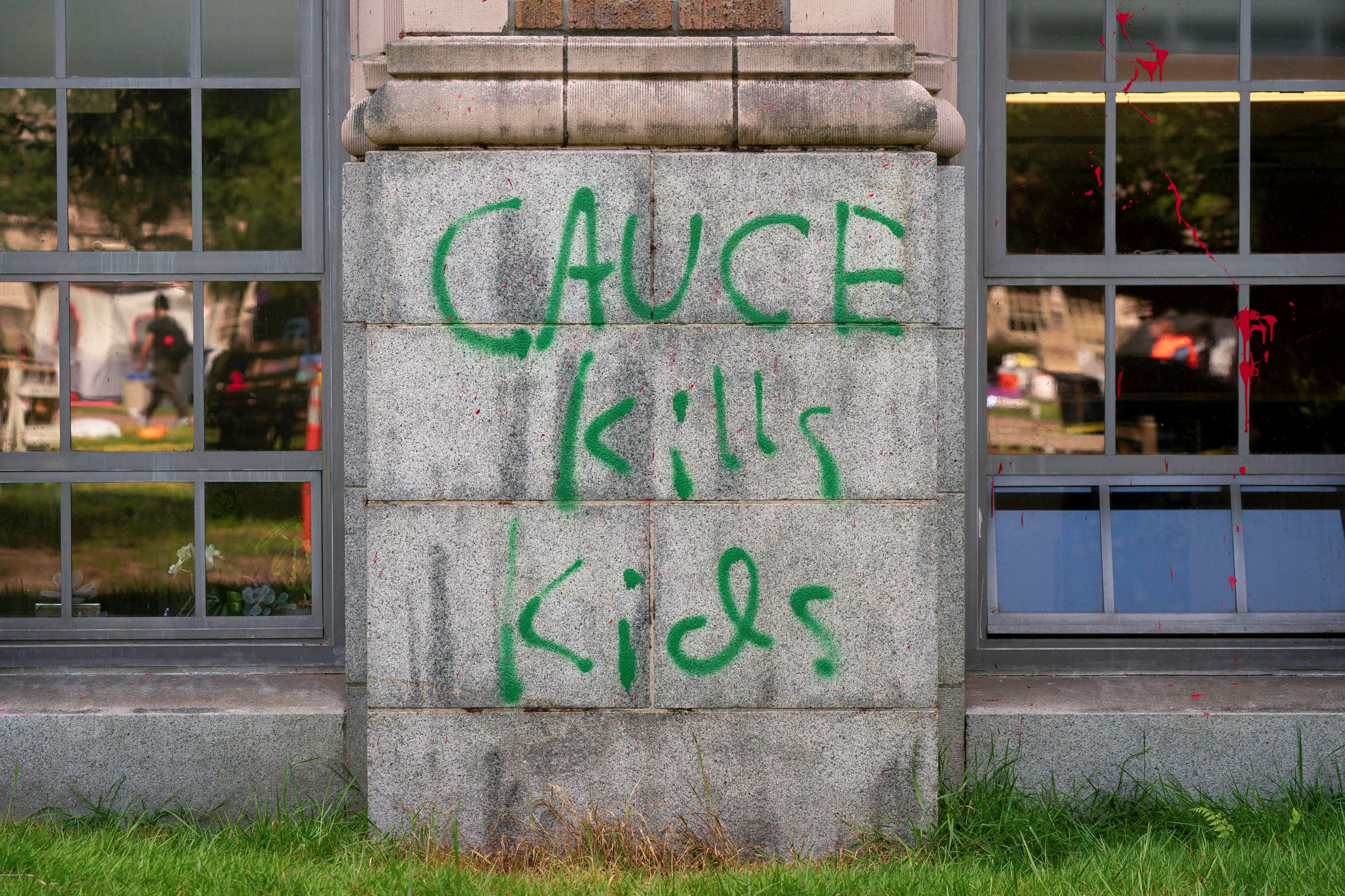 Graffiti referencing university president Ana Mari Cauce is seen as people pack up to leave a protest encampment in support of Palestinians in Gaza after protesters agreed to voluntarily end the camp by Monday afternoon at the University of Washington in Seattle, Washington on May 20, 2024. (Photo by David Ryder/Reuters)