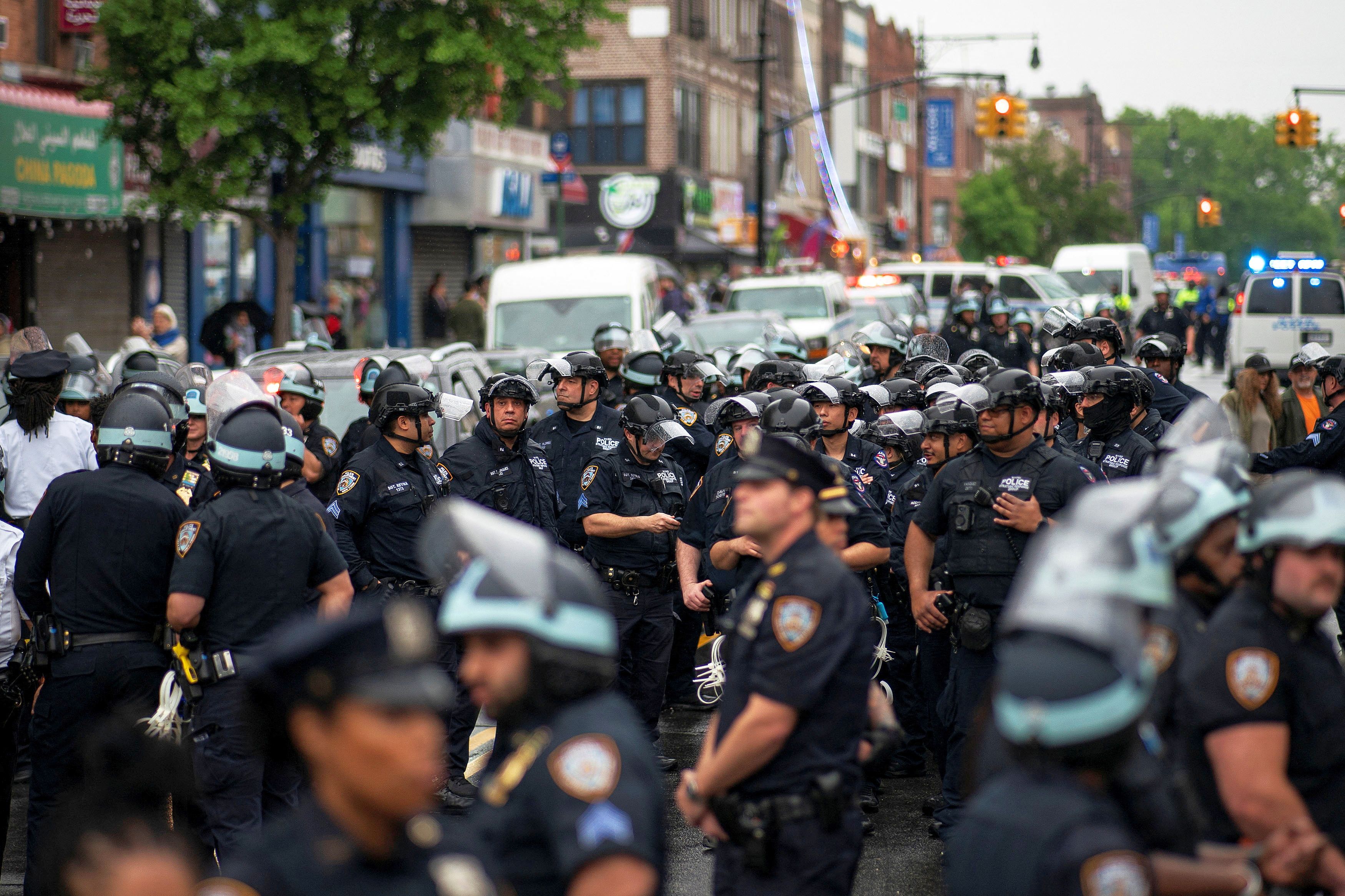 New York Police Department officers stand guard as Pro-Palestinian protestors demonstrate, amid the ongoing conflict between Israel and the Palestinian Islamist group Hamas, in the Brooklyn borough of New York City, on May 18, 2024. (Photo by Eduardo Munoz/Reuters)