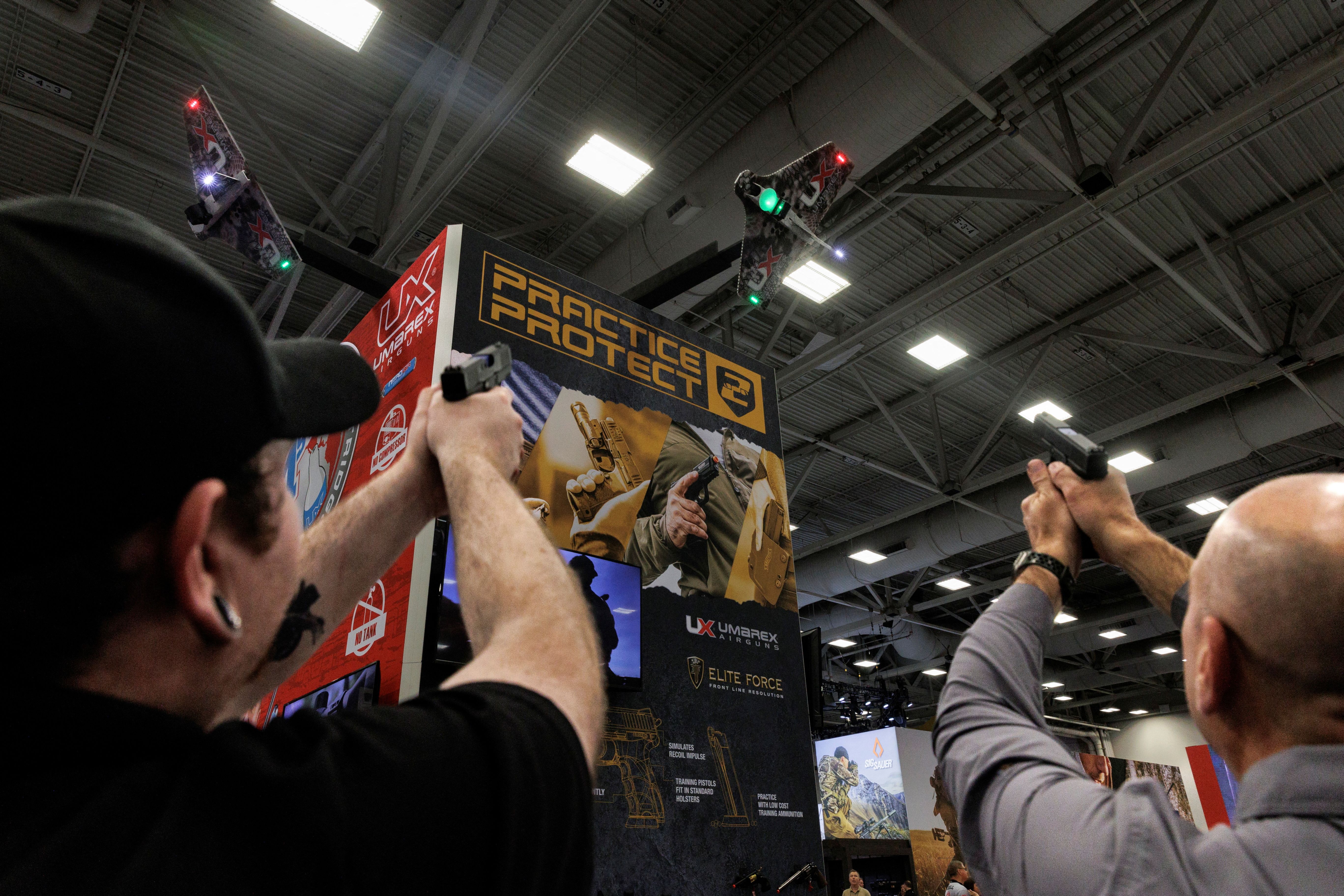 People practice their shot with laser technology at an exhibition booth during the annual National Rifle Association (NRA) meeting in Dallas, Texas, U.S., May 18, 2024. (Photo by Shelby Tauber/Reuters)